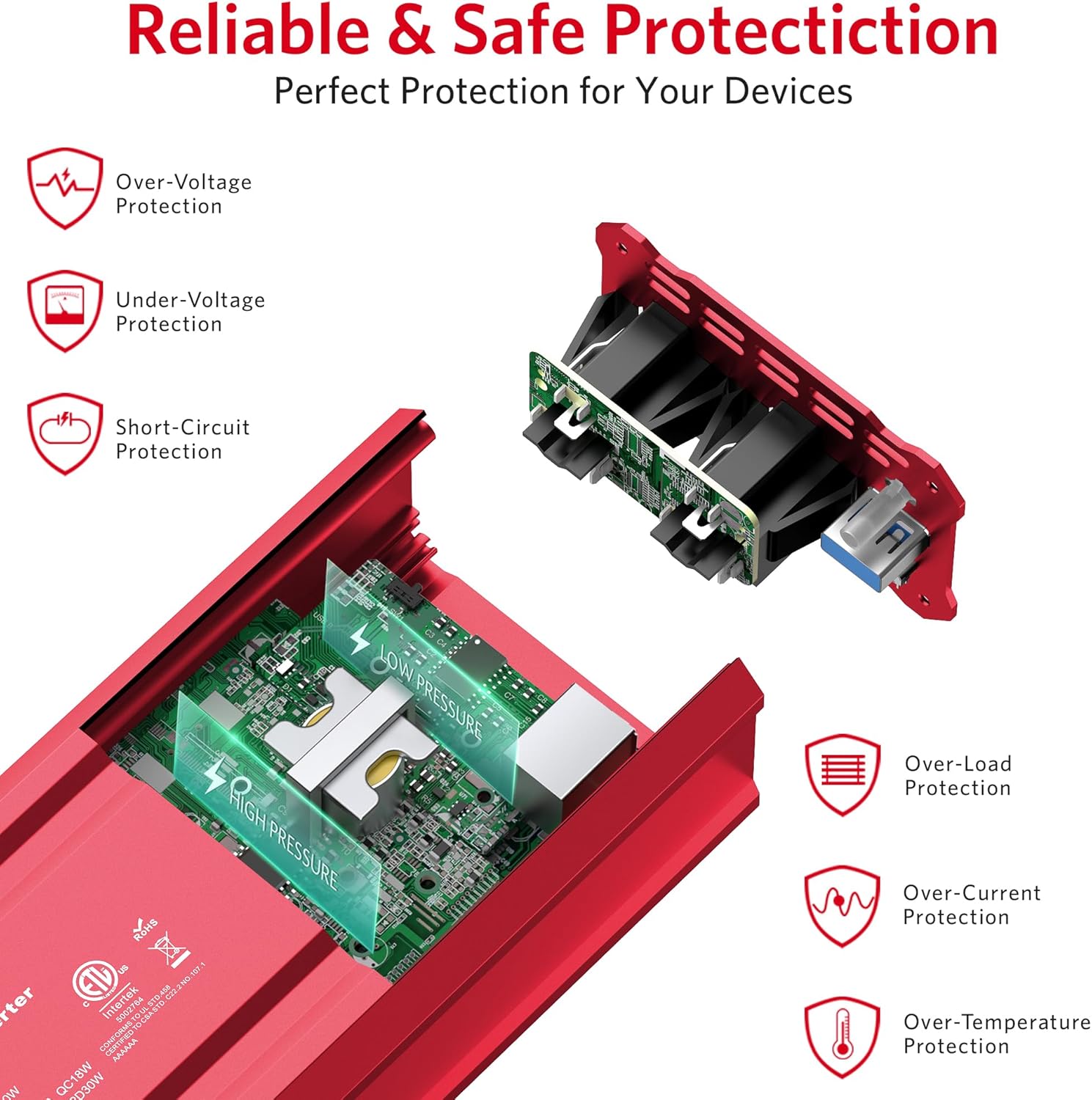 - Converts DC power from your car battery to AC power for you to use within its watt range. Plug it into a 12V cigarette lighter socket to provide continuous DC to AC power, 2 AC sockets to operate any 110V device, 1 USB-A port (QC 18W) and 1 USB-C port (PD 30W ) intelligently detects your device and automatically provides the fastest charging speed, up to 2.4 amps per port / 4.2 amps maximum.