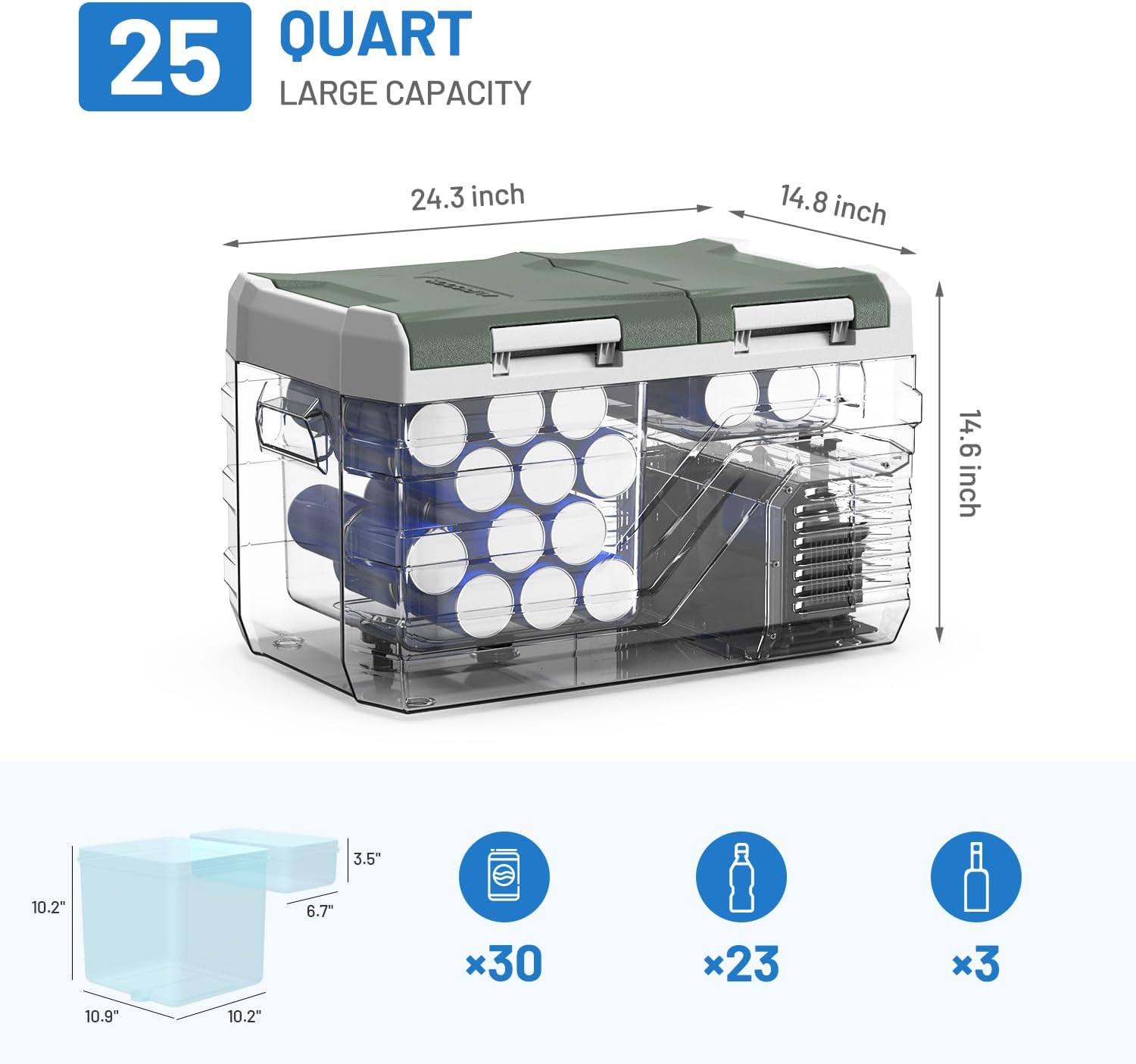 - LARGE CAPACITY & 2-WAY DOOR: Our car refrigerator is equipped with an expansive 25 quarts capacity, which can hold up to 30 cans of cola (12fl oz) or 23 bottles of water (16.9fl oz) or 3 bottles of wine (25fl oz), allowing you to enjoy chilled beverages and fresh food during the trip. This 12 volt car fridge is designed with two doors with different opening direction, which make it convenient for you to access from any angle.