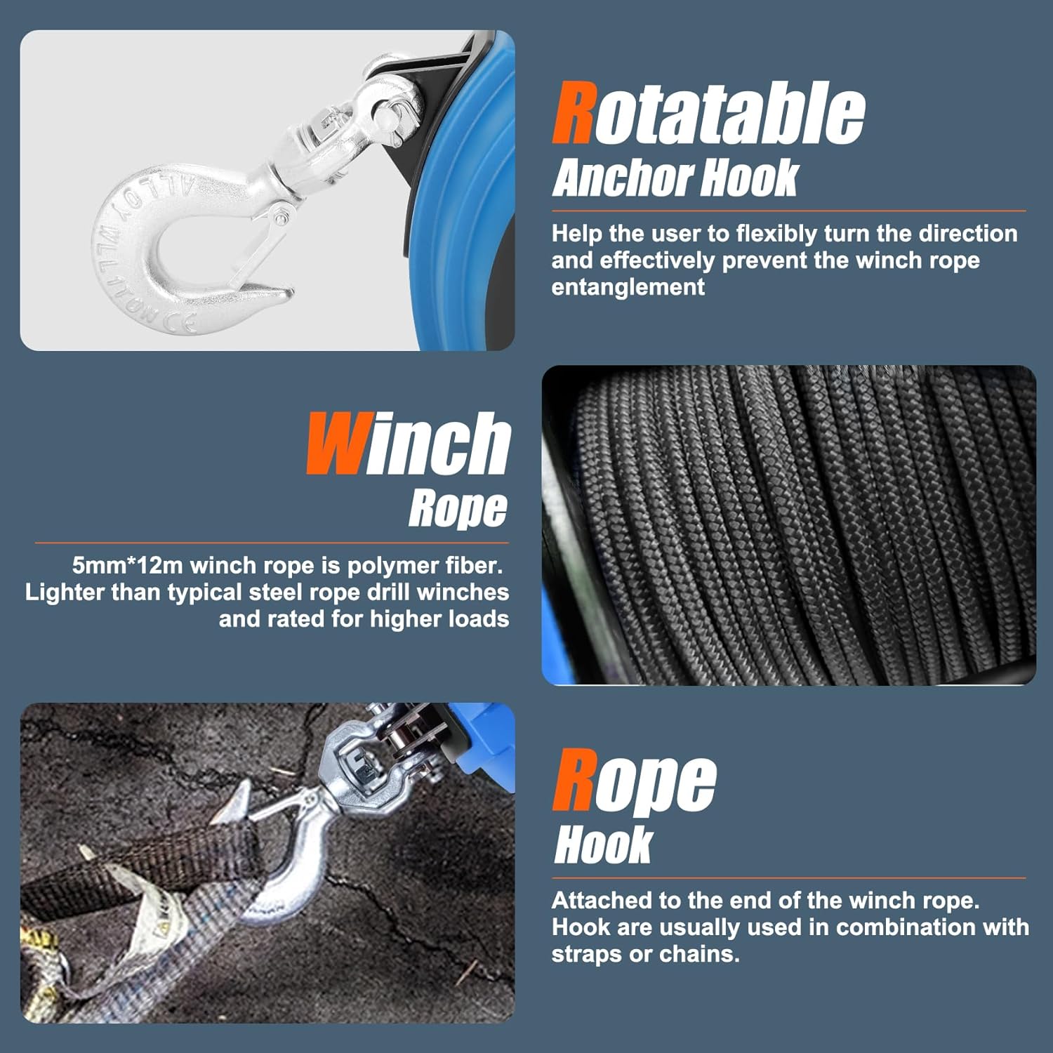 Portable Drill Winch of 1000 LB, Red Handheld Drill Winch with 40 Foot Synthetic Rope, Rotate The Hook 360 Degrees, for Lifting & Dragging (Blue)