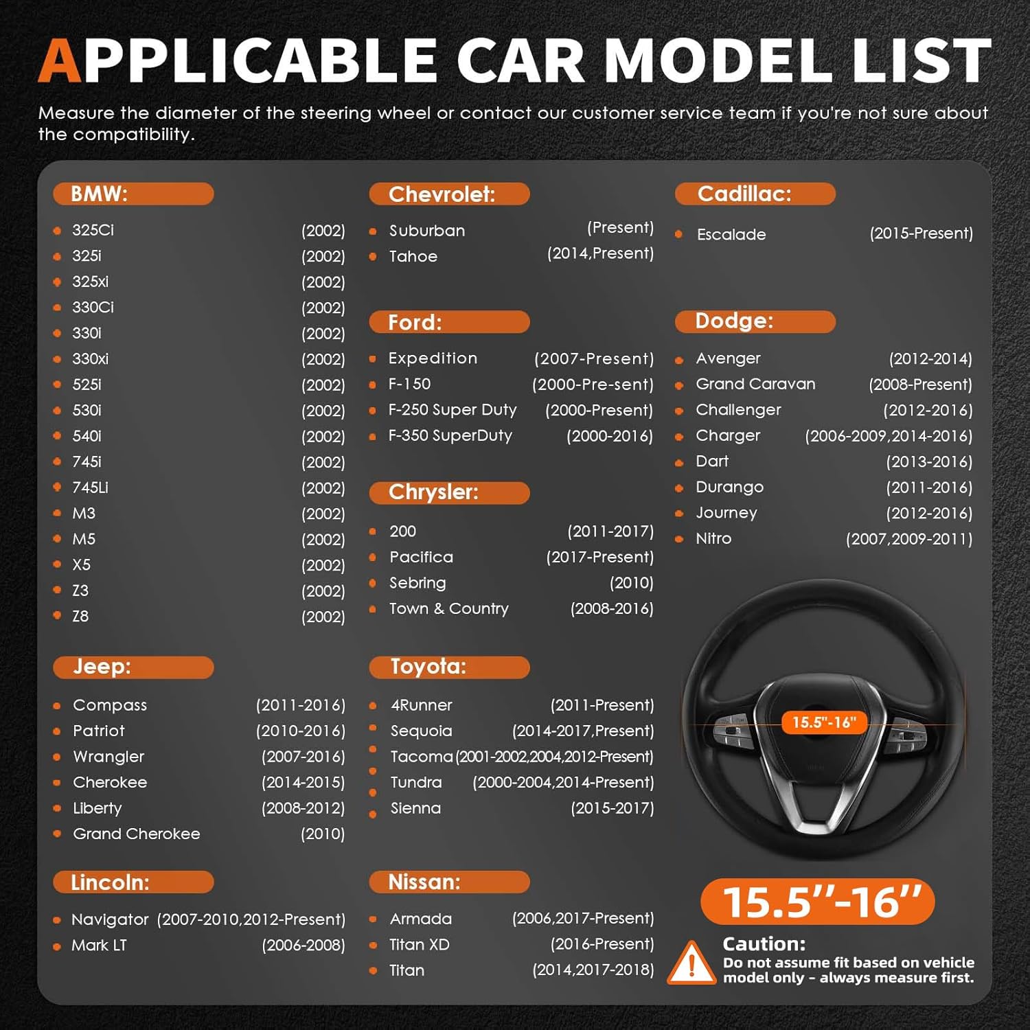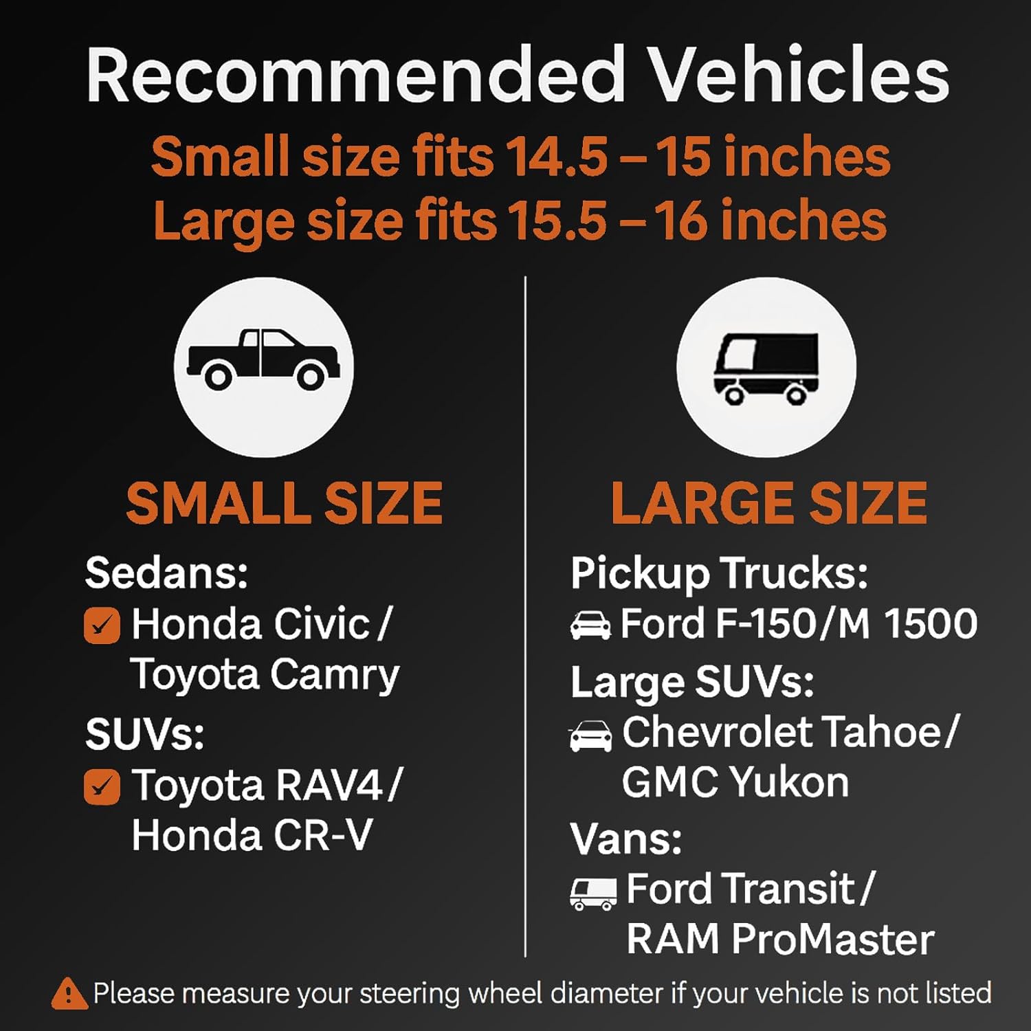 • FITS LARGE STEERING WHEELS–SIZE GUIDE INCLUDED: This HOTOR leather steering wheel cover is designed for large-size steering wheels (15.5–16.0 inches ). It fits full-size pickup trucks, large SUVs, and commercial vans, such as Ford F-150, RAM 1500, Chevrolet Tahoe, and Ford Transit.Before ordering, we strongly recommend measuring your steering wheel diameter to ensure the correct size selection