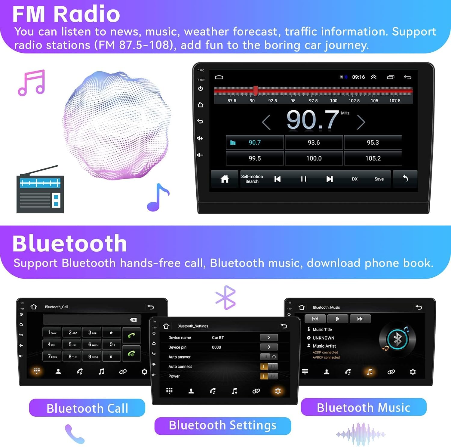 - ăBluetooth & FM RadioăBluetooth support incoming and outgoing calls/synchronize address book/support mobile phone music playback. You can transmit music to the car stereo through FM, enjoy the original car stereo, support radio stations (FM 87.5-108), add fun to the boring car journey.
