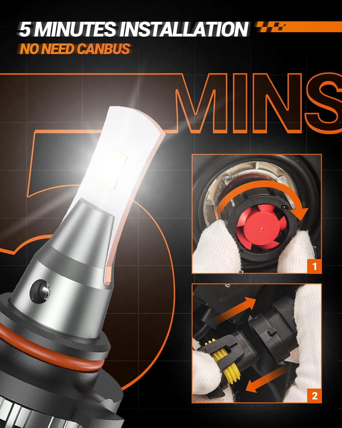 - Over 50,000 Hours: 9005/HB3 bulbs with aerospace aluminium housing, copper thermostat plate and 15,000 RPM turbo cooling fan can reduce core temperature to below 220°F, extending the average life of each light to 20 years, eliminating the hassle of frequent bulb changes