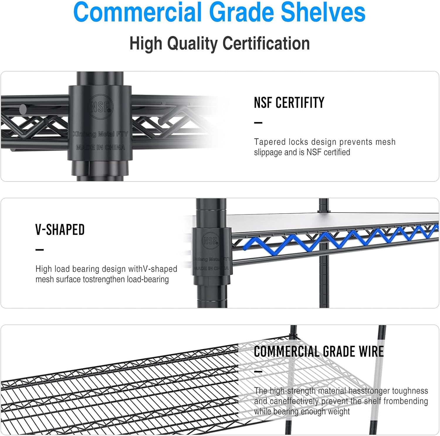 - STURDY & EXTREMELY DURABLE - Wire shelving made of heavy steel, it has excellent rust resistance and oxidation resistance. Our wire shelf liner is crafted to provide unparalleled quality, longevity, function and beauty. Better quality thicker than the competition. The 5 tier shelf unit passed NSF certified, safe and reliable. Storage rack are perfect addition to home, office, garage.