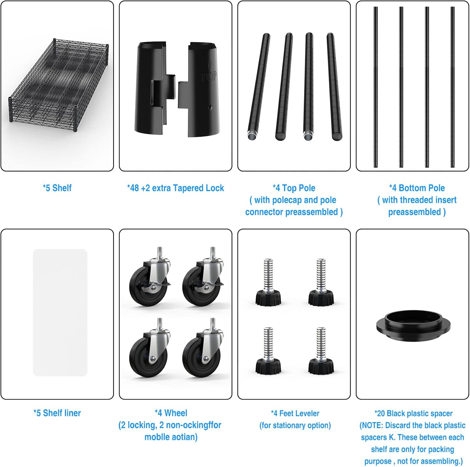 - EASY MOVEMENT - 5 tier garage shelves have 4 leveling feet, 4 4-inch industrial wheels(2 lockable). Wire rack on wheels can be easily positioned in supermarkets, garages, closets, kitchens, porch, pantry, etc. Height-adjustable leveling feet can be placed on uneven ground- simply twist to stabilize. Non-slip, will not scratch ground.