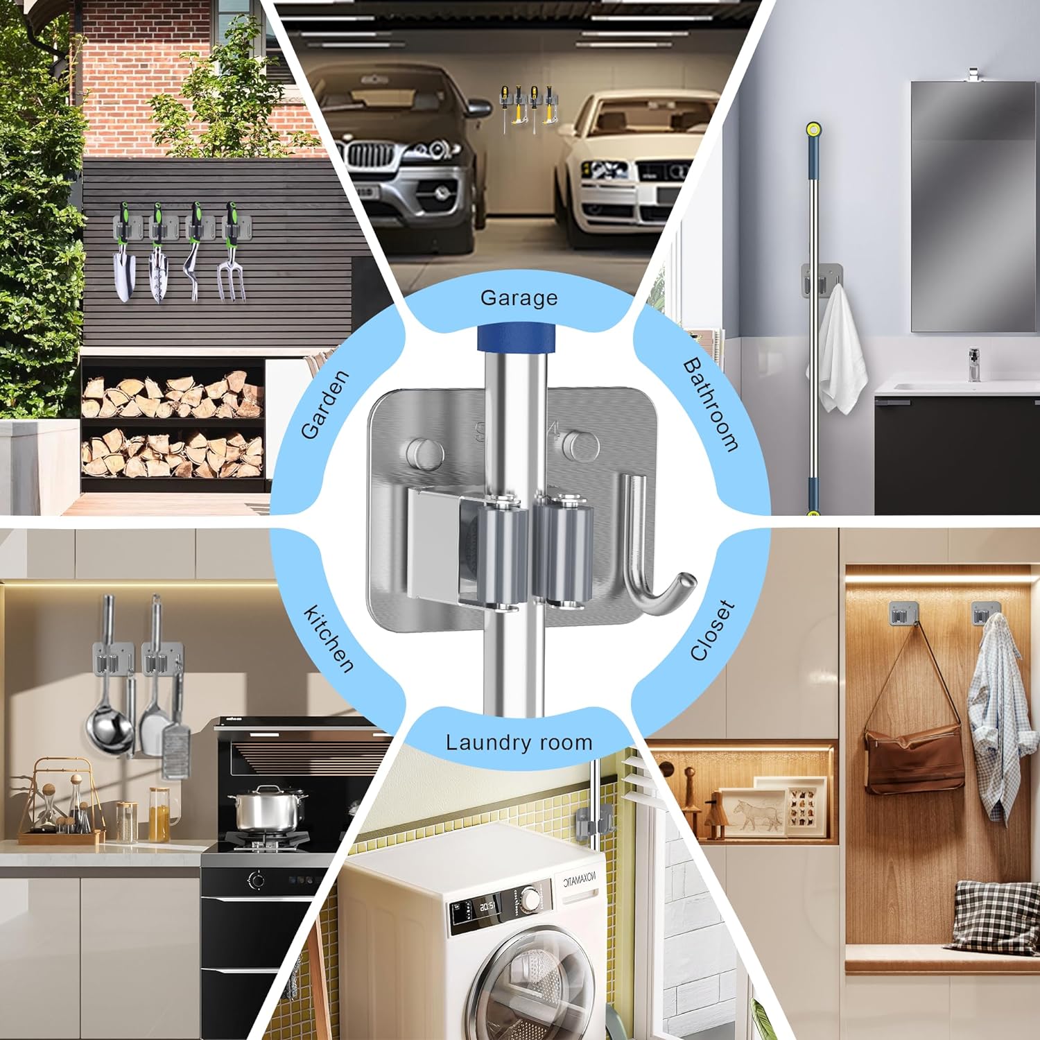 - Economical 4-Pack: This value set includes 4 broom organizer wall mount and 10 screws. Spread them across multiple rooms or create a dedicated cleaning station. The elegant silver finish complements any décor, offering both functionality and style