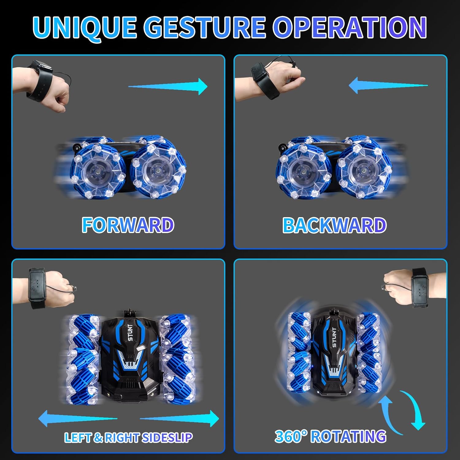 - 4WD Gesture Sensing RC Stunt Car: This rc stunt car comes with a remote control and a gravity sensor watch. You can put the toy car moving, rotating, off-road mode, children can drive the transforming car at will and experience different fun