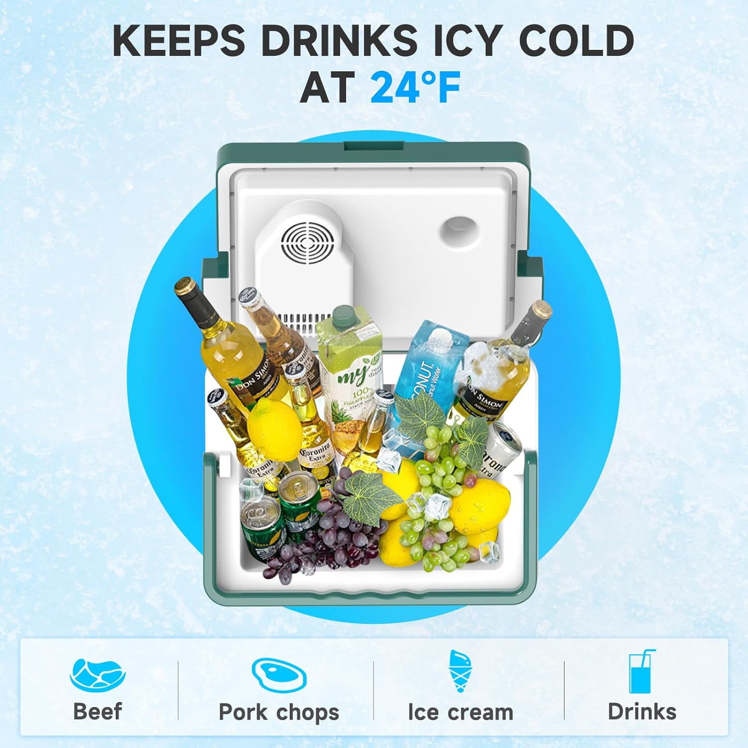 - Keep Cooler and Warmer: Our electric cooler both cooling and heating functions.Maintains the drinks icy cold at 24°F(-4.5 ℃) or the hot food at 147°F(64 ℃).Whether you're on a road trip or camping in an RV,this car cooler guaranteed to keep your drinks cold and your food fresh!