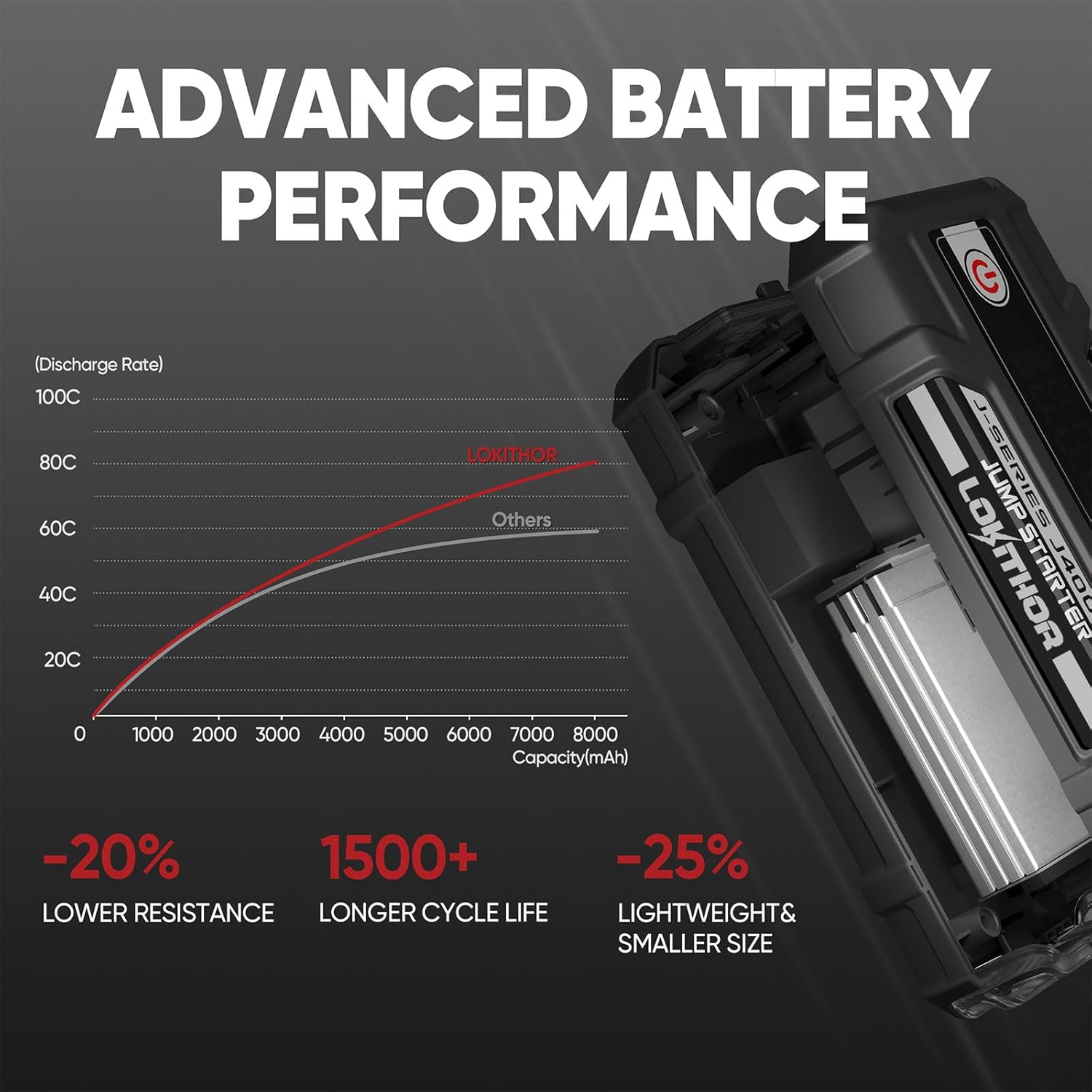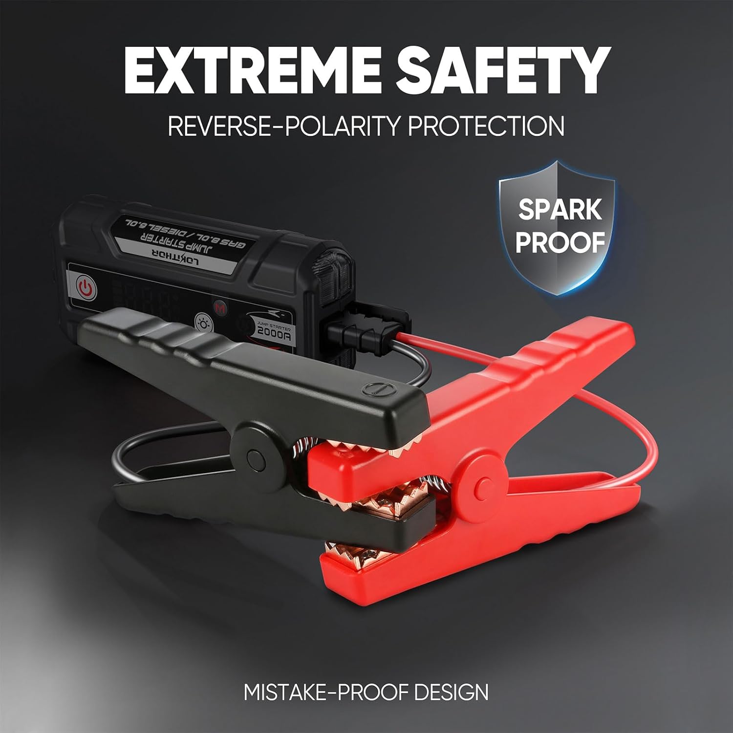 • Extreme Safe - Designed with an integrated battery management system and smart self-identifying clip, the LOKITHOR emergency starter is safe and fully insulated. 10 protection types, including Spark-Proof Protection, Reverse-Charge Protection, Over-Charge Protection, Over-Current Protection, Short-Circuit Protection, Reverse-Polarity Protection, Low-Temp Protection, High-Temp Protection, Over-Voltage Protection , Over-Load Protection, securely connects to any 12-volt vehicle.