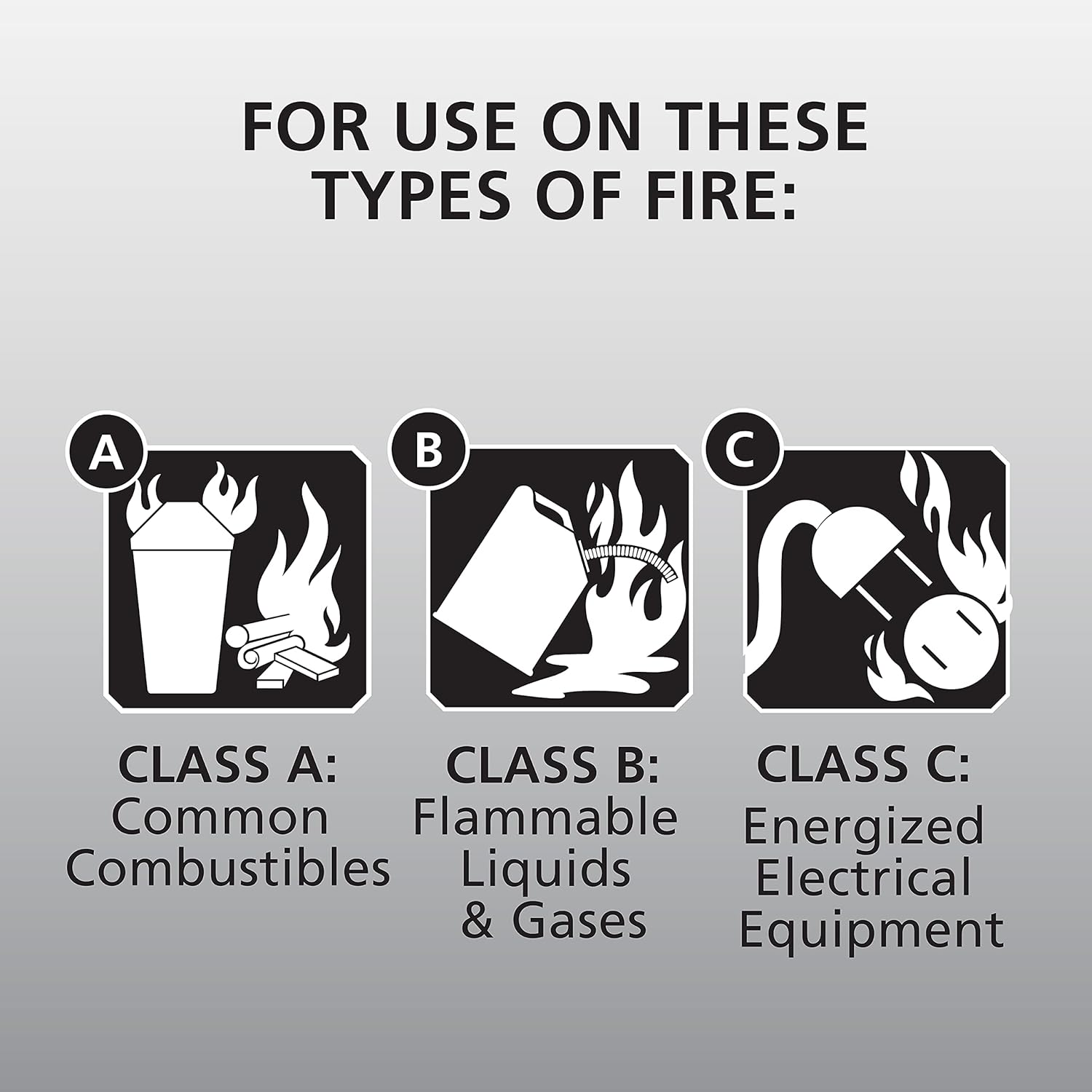 - Product 2: Use to fight basic fires common to the home involving trash, wood, paper (Class A), flammable liquids and gases (Class B), and electrical equipment (Class C)