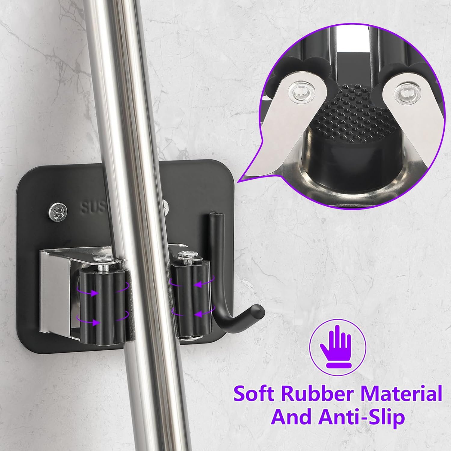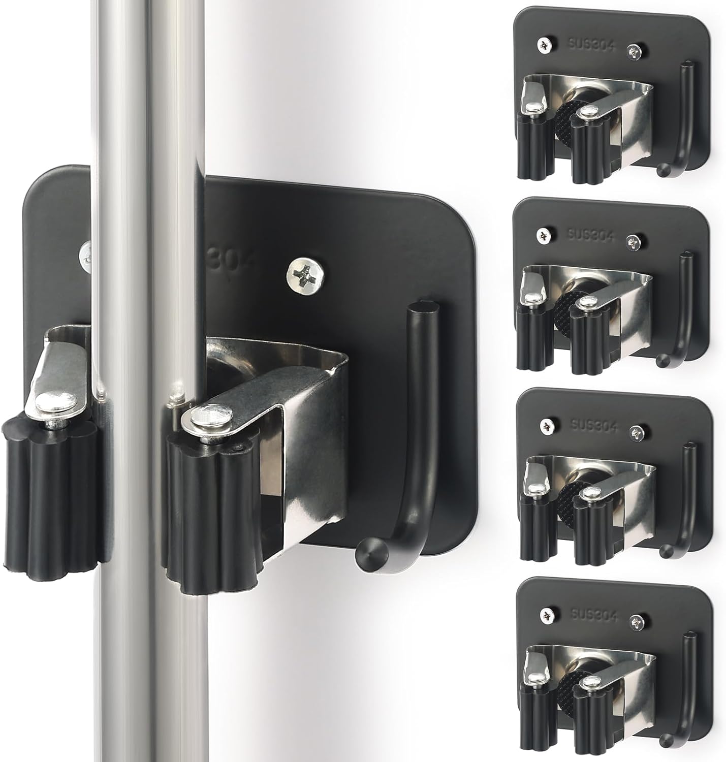 - Rod Holder - Home Improvement Items, Wall Mount Metal Mop and Broom Organizer and Laundry Garden Kitchen Tool Rack, Wall Hanger for Home Goods, 4 Gripper Positions with 4 Hooks,Black-Silver