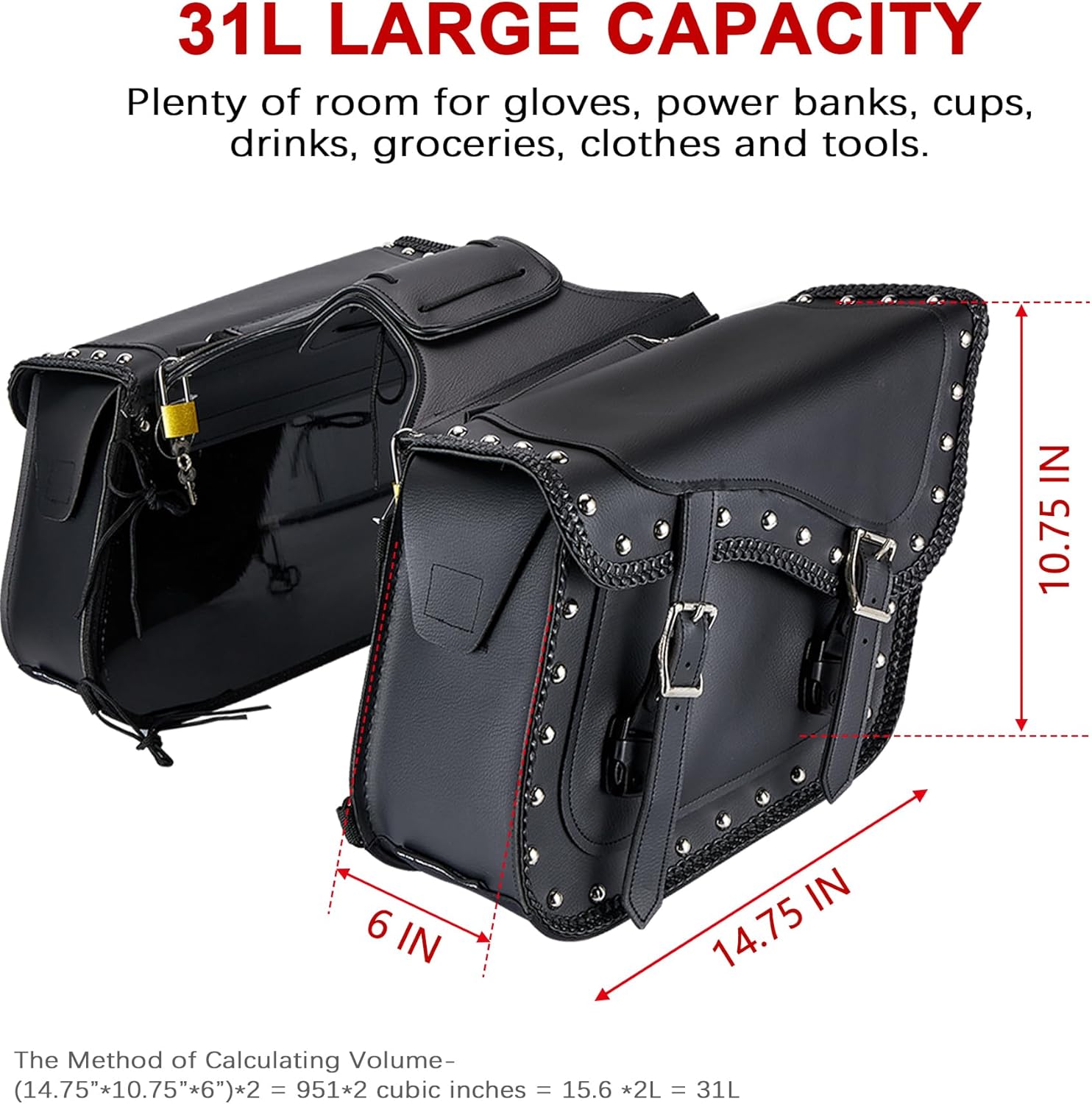 - [Fashion Appearance and Flap Design] - Thin braiding is built along edges and makes the saddlebags more fashion. The black saddle bags will give your motorcycle a new look while also greatly expand practicality of bike. Flap design and strong stitching make sure that the saddle bags will not lose luggage when riding fast on bumpy roads. Flap design helps prevent dust or rain from entering and keep items clean and dry.