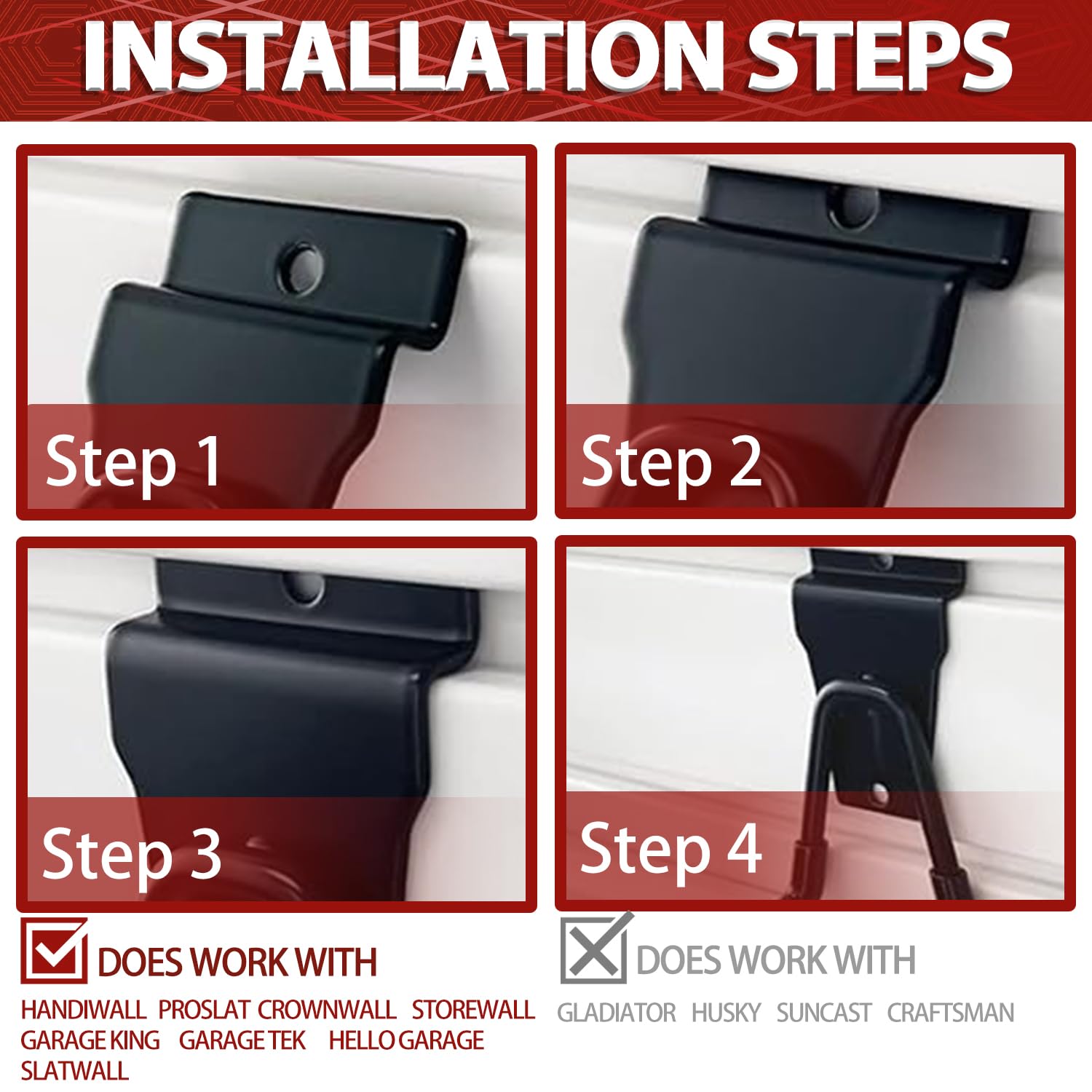 - Easy to Install and Space Saving: slat wall hooks fit standard slat wall like Proslat, Handiwall, Crownwall, etc., you can directly place slat wall hanging hooks to both sides of the panel groove, fix garage hooks for hanging into the groove on the panel then press slatwall brackets down and ladder hook will fit perfectly. Then you can move garage hooks to anywhere you want to put, saving you time and effort