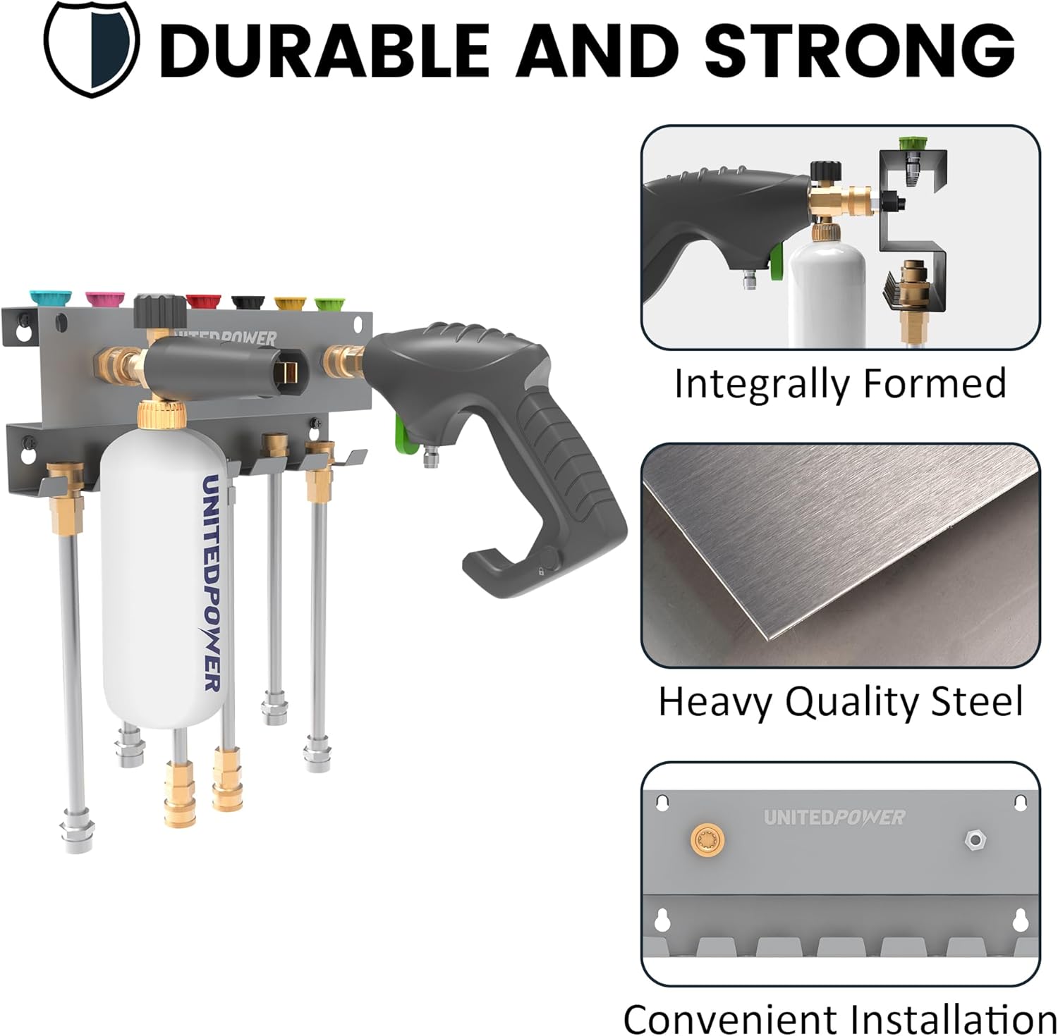 - Simple yet Multipurpose: All in one Pressure Washer Gun Accessories Storage Rack, Come with 1/4 inch quick connect male and female fittings, hold up pressure washer gun, foam cannon, nozzle, and wand extension wand simultaneously, keeps your workspace organized, decluttered and tidy