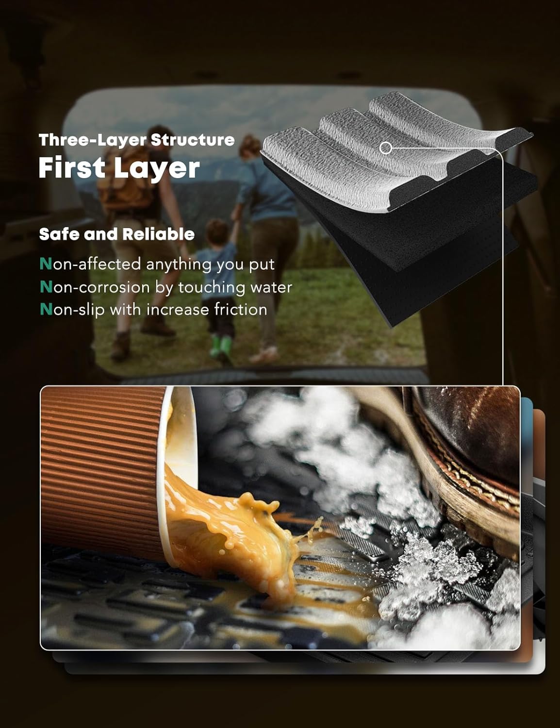 - Easy to Clean & No Edge Curl: If there is any dirt in floor liners, just take it off and rinse it. There is no need to worry about the edge curl after repeated washing and drying, and the TPE material and process of the floormats ensure a stable fit