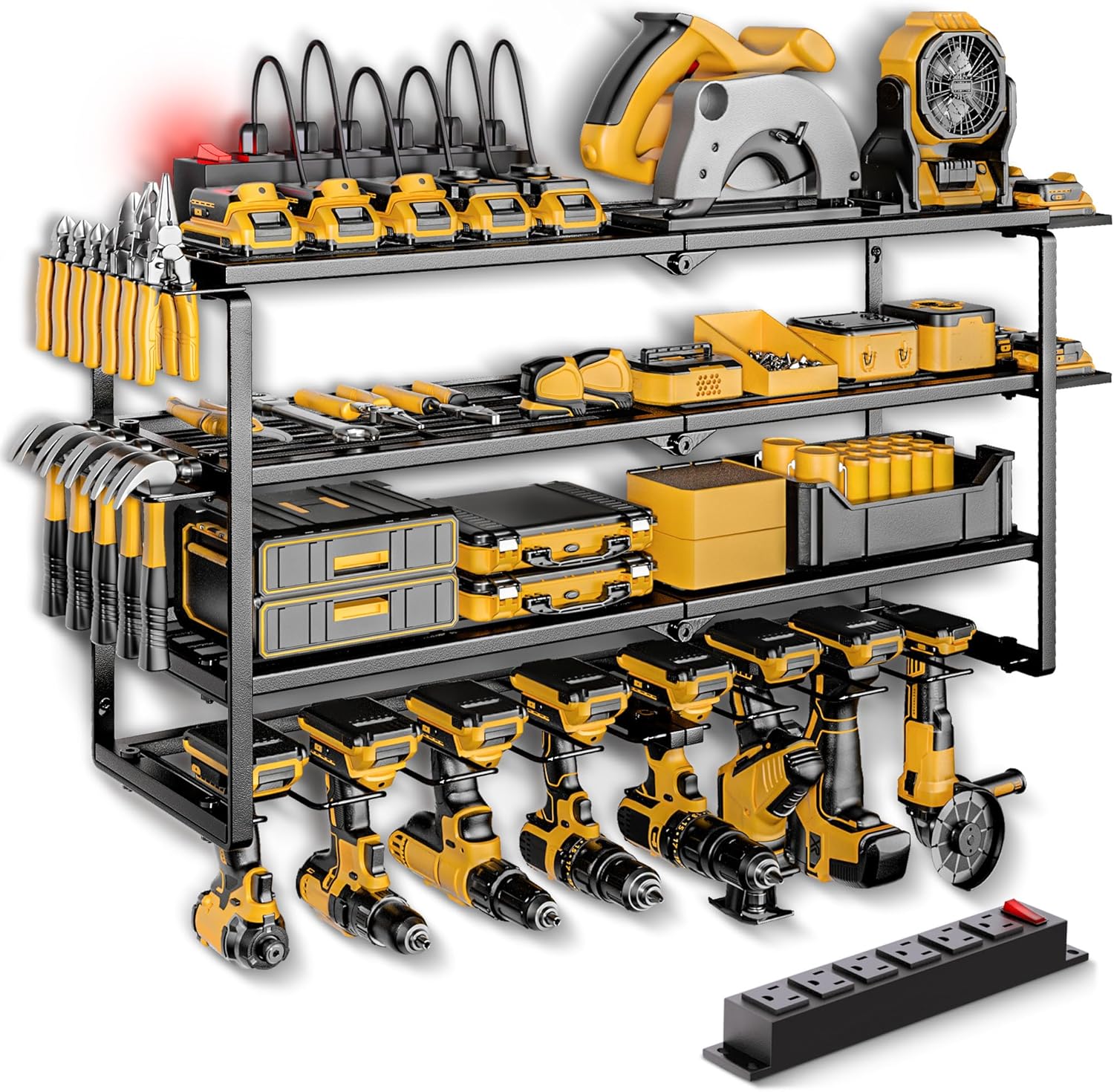 Power Tool Organizer Wall Mount with Charging Station, 4 Layer 8 Slots Cordless Drill Holder for Garage Storage, Utility Racks Max 420lbs Load With 6 Outlet Power Strip for Fathers Men Gift