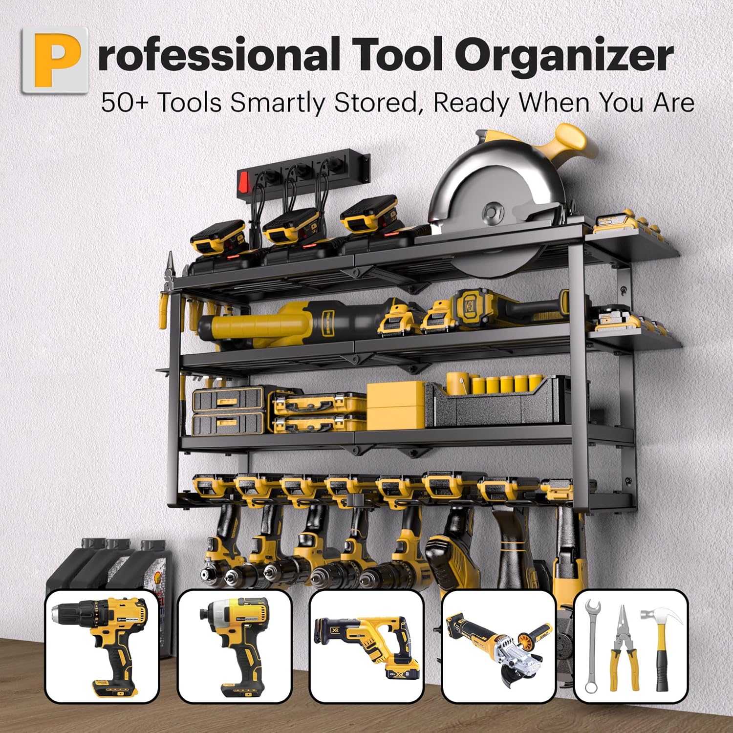 - High Capacity Design: This wall-mounted power tool storage features a 4-layer high-capacity design. You can hang at least 8 power drills, impact drills, cutting machines, angle grinders, and other hand-held power tools. The upper two layers can accommodate batteries, chargers, and other tools