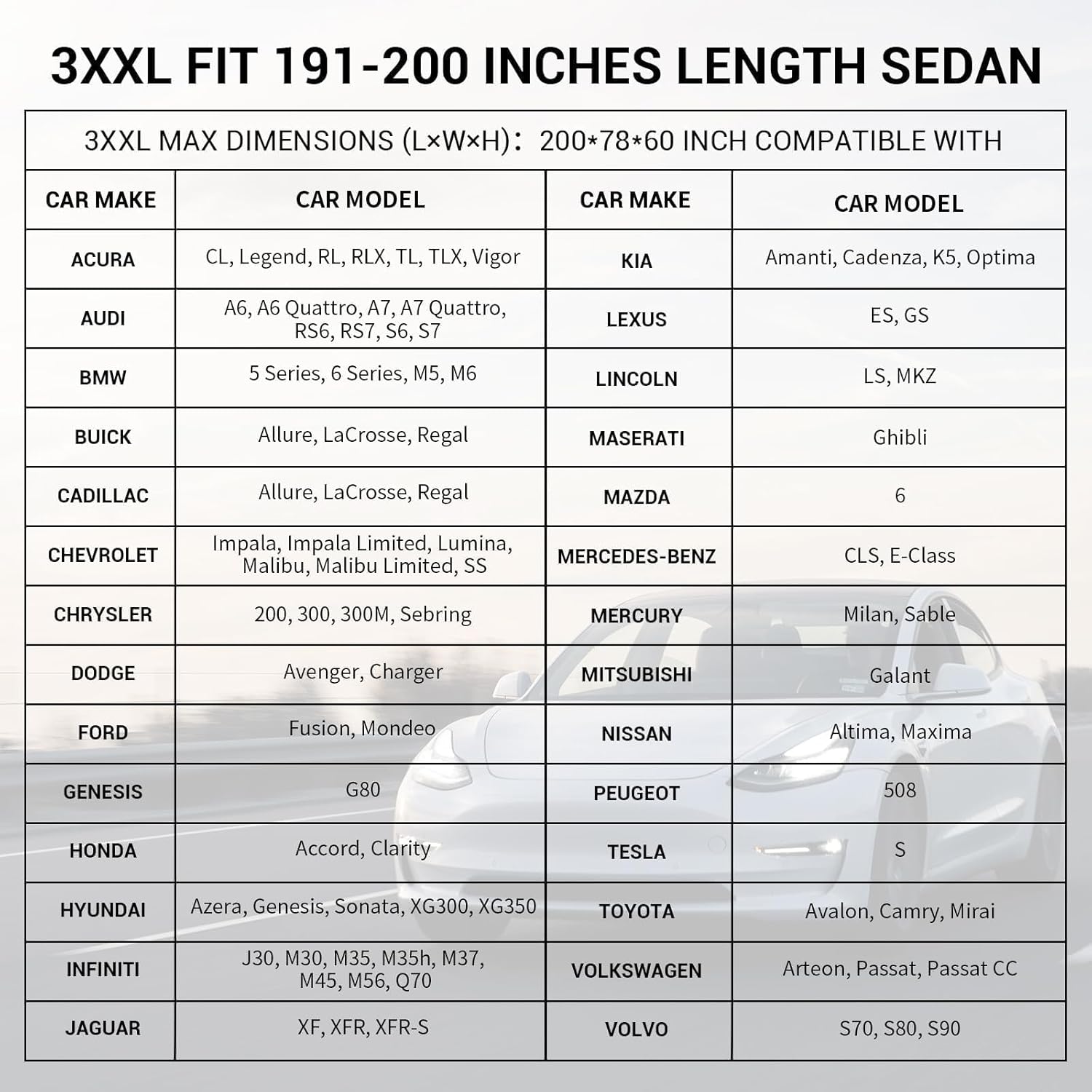 - UNIVERSAL FITMENT: Our 3XXL universal car cover is fit for sedan which length is 191 to 200 inches. Compatible with Hyundai Azera/Genesis/Sonata, Infiniti Q70, Kia Optima/K5/, Lexus ES, Nissan Altima/Maxima, Honda Accord, Chevrolet Malibu, Dodge Avenger/Charger, Chrysler 300, Ford Fusion, Acura CL/Legend/RL/RLX/TL/TLX, Audi A6/A7, Buick LaCrosse/Regal, Cadillac CT5/CTS, Lincoln MKZ, etc. The Tecoom weather proof car covers are extensively tested to achieve a custom-like fit for each vehicle