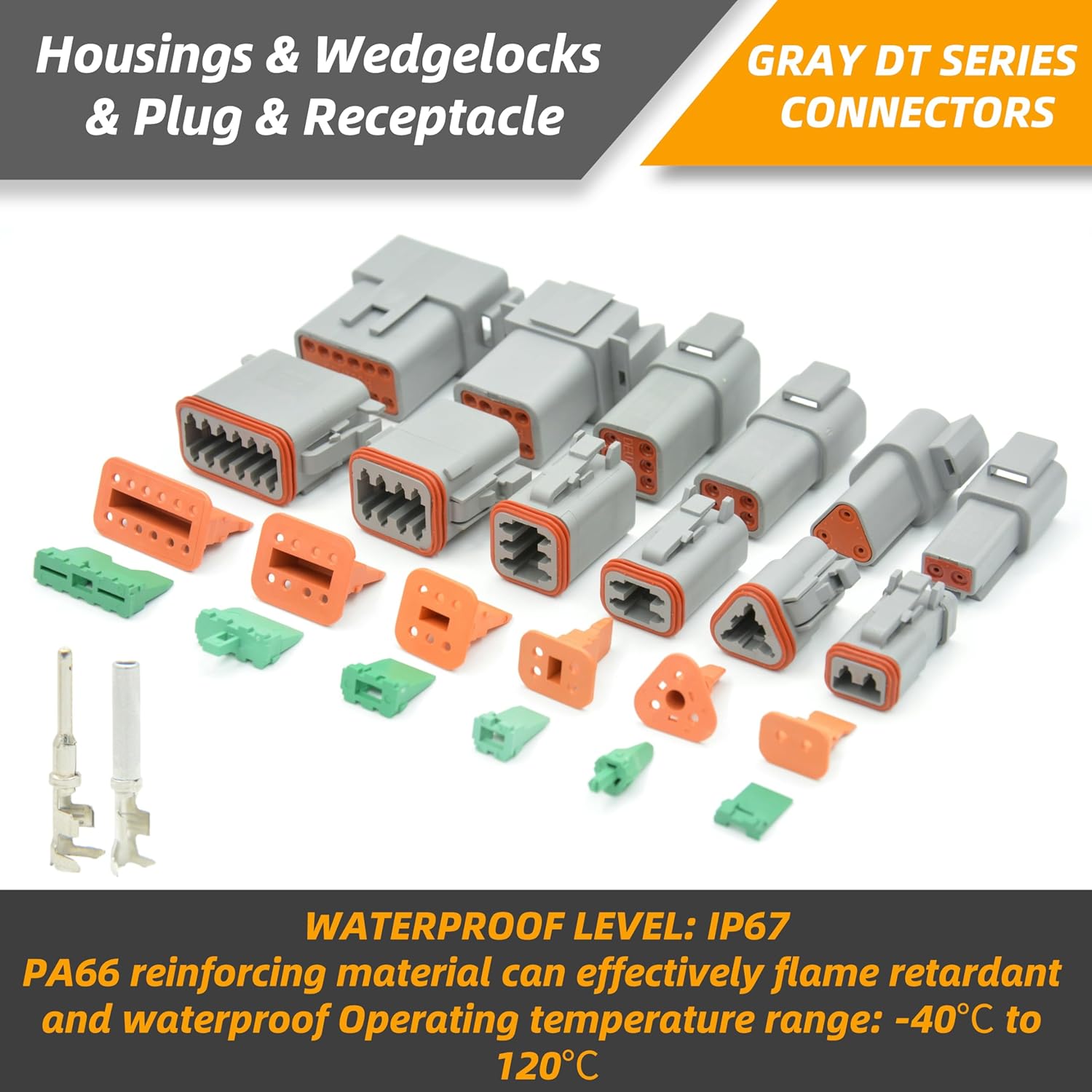 - ✅HIGH PERFORMANCE DEUTSCH CONNECTOR & TERMINALS: Deutsch connector is made of PA66+30%GF nylon, waterproof rating: IP67. Temperature resistance range: -40℃-125℃. Suitable for long time use.