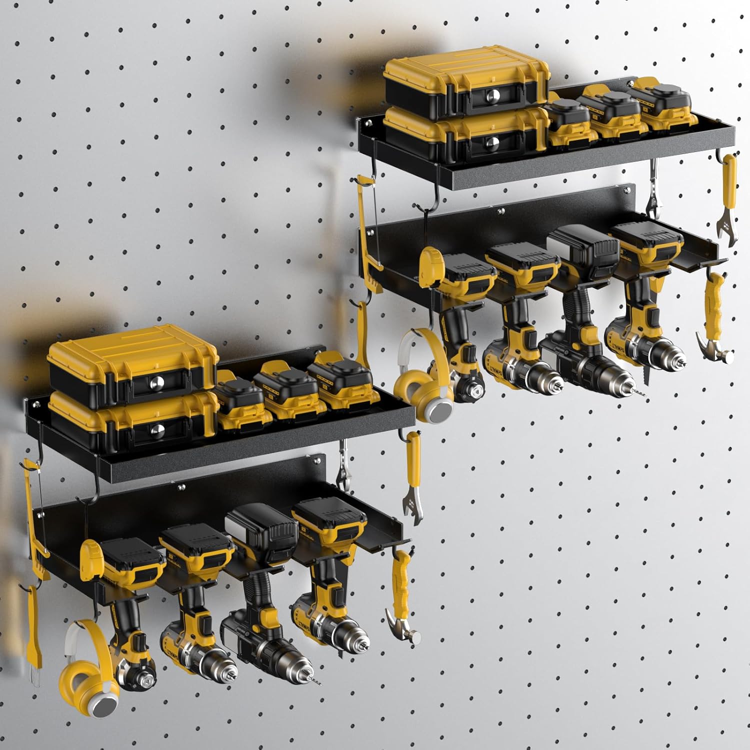 - Well storage and Space Saving: The power tool organizer is perfect for workshop storage.Make your garage and workshop keep roomy space and tidy. Convenient to see various tools and hold or place them. Compatible with pegboards,brick and wooden wall