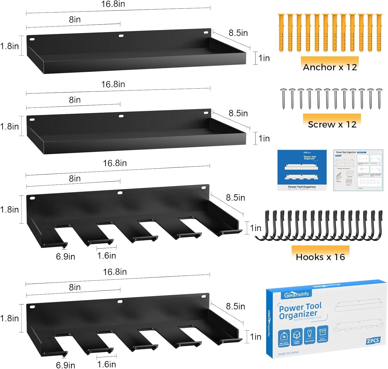 - Easy to Install: We offer installation manual, Power Tool Organizer*4pcs(2pack), Hooks*16, Screw*12, Anchor*12. It is removable, just use screws to connect the steel rack and hang it on the wall