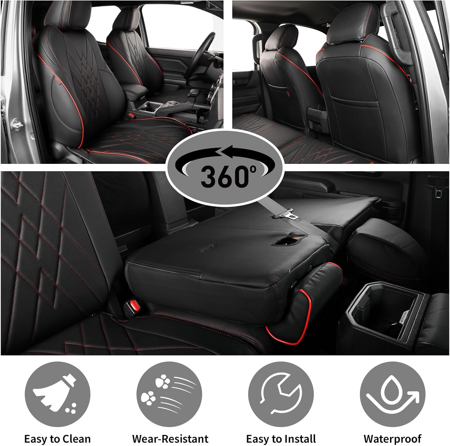EKR Custom Fit Tacoma Car Seat Covers for Select Toyota Tacoma (Petrol) 2024 2025 Double cab SR,SR5,TRD Sport,TRD Off-Road,Limited - Full Set,Leather(Black with Red Trim)