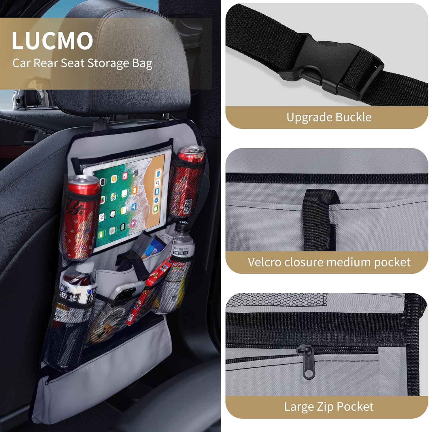 - 【Premium Material】LUCMO car seat organizer is made of high quality polyester with perfect waterproof property and good durability. Making your car looks very luxurious! Besides, it protects the back of your car seat from dust, abrasion and kicking dirts.