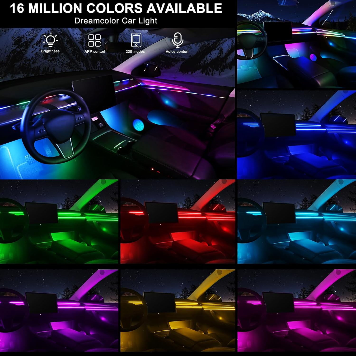 - ăHigh Bright & UniformăThe Dream+color Acrylic Car Ambient Interior Lighting have super bright LED and acrylic lens and contains 6 LED strips (4*29.5inch+1*43.3inch+1*14inch), Foot well lamp*4(44.5inch*2/64.9inch*2) and Door handle light*4+doors storage box light*4 (21.6+21.6inch)+Door horn light*4(5.9inch+ line 19inch*1), also comes with 1 main controller and 4 sub controllers,and can be flexibly installed on any car by DIY without disorganized, which is plug and play, and this acrylic light evenly spread over the lamp strip is brighter, more uniform and softer than other optical fiber lamps that rely on only one LED.