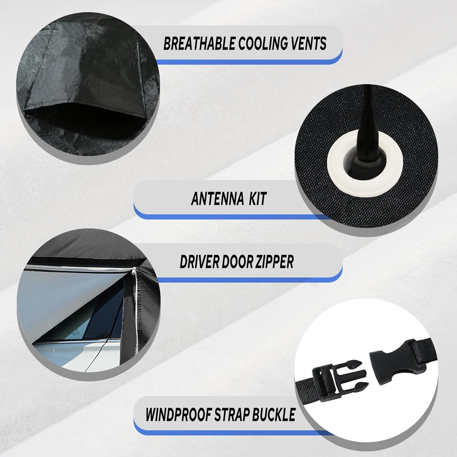 - ăMultifunctional Designă1. ATHUPEAD car cover has three buckle-type reinforced windproof straps in the front, middle, and back, which can resist strong winds. 2. There is a door zipper on the driver's side for easy access to items. 3. The unique reflective strip design reminds others at night to ensure parking safety. 4. There are vents on the side of the car cover, which can prevent moisture accumulation inside and keep it dry, allowing for faster ventilation in summer. 5. The car cover provides an antenna protection kit. If your car has a fixed antenna, you can refer to the video on YT to DIY an antenna port on the top of the car hood.