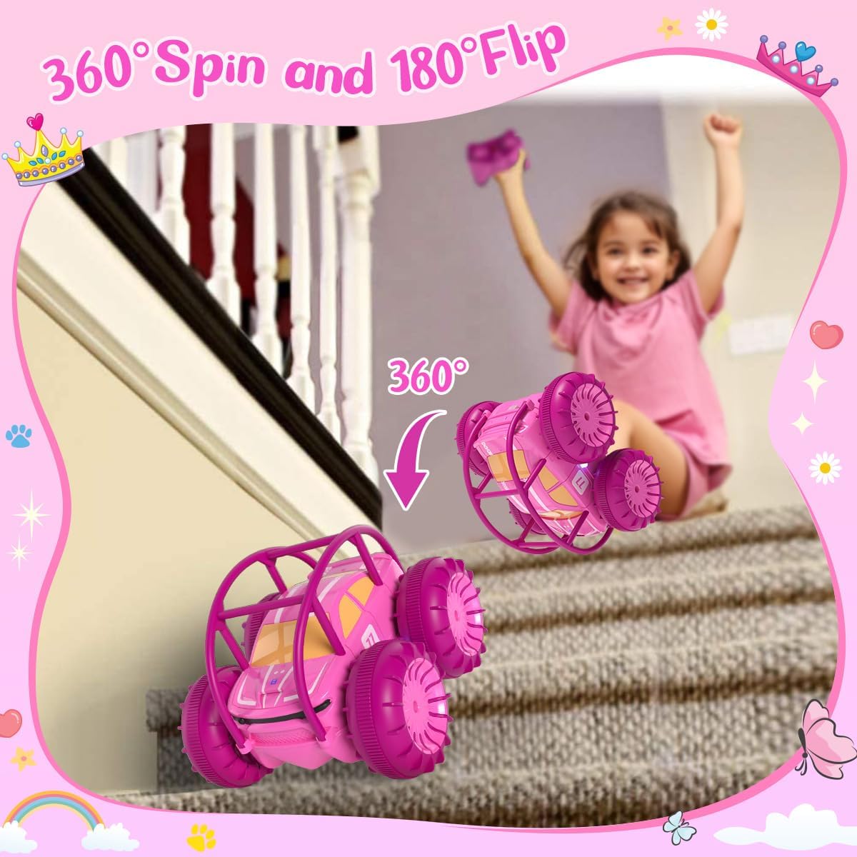 - Fancy Stunts, Colorful LED - This electric stunt car with unique protective cage enables 360° flips and turns. The bright, colorful and flashing LED lights can attract children's attention at once, this toy car for kids use strong material very suitable for children to play. It is indeed the perfect birthday, holiday, christmas gift for boys and girls aged 3-12.