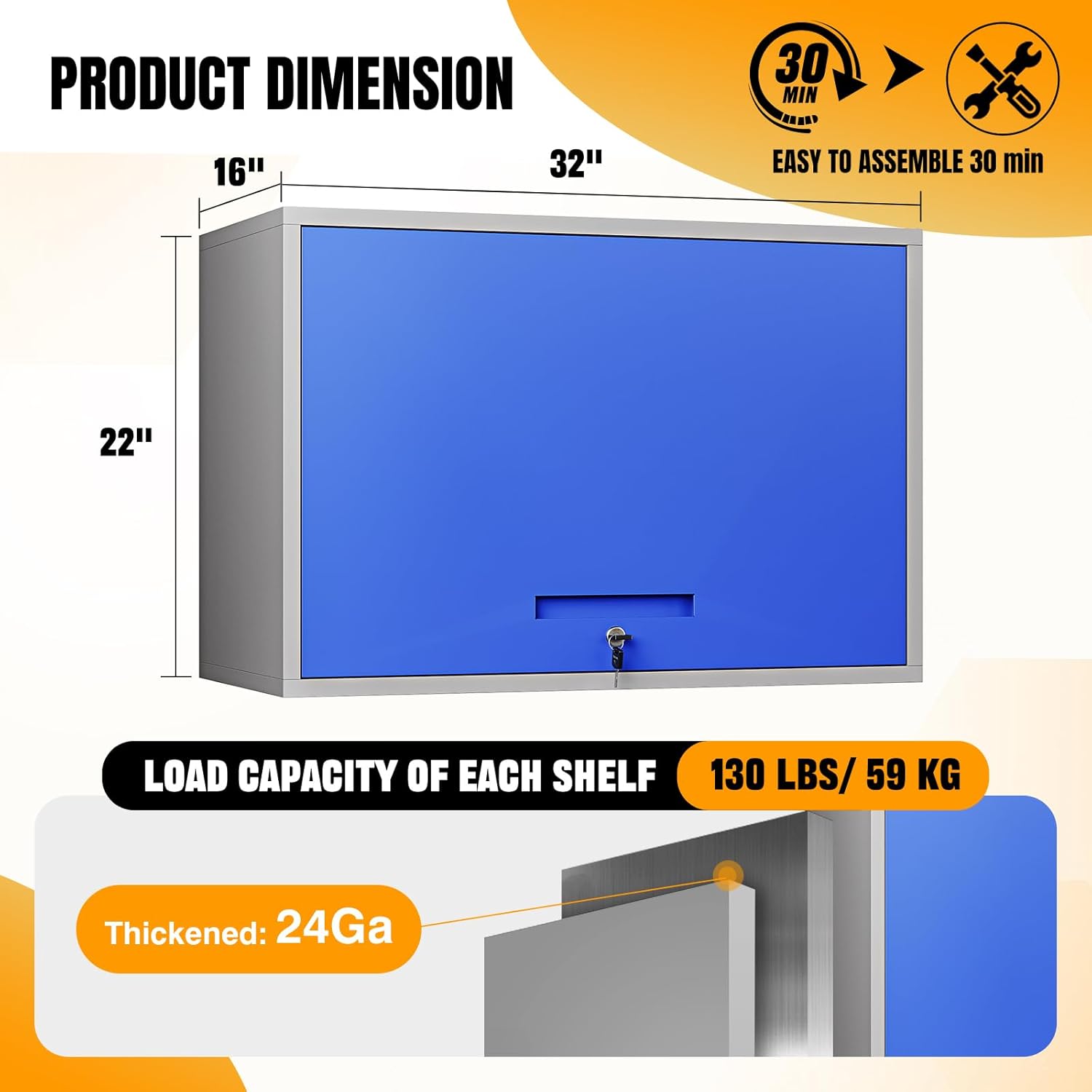 - ✅➤【High quality wall cabinet】:The Floating Metal Garage Cabinet is made of pressed sheet metal 0.65 mm SPCC steel plate. It is sturdy, and the steel is powder coated, which helps prevent rust. The robust steel construction can support up to 130 lbs for each shelf.