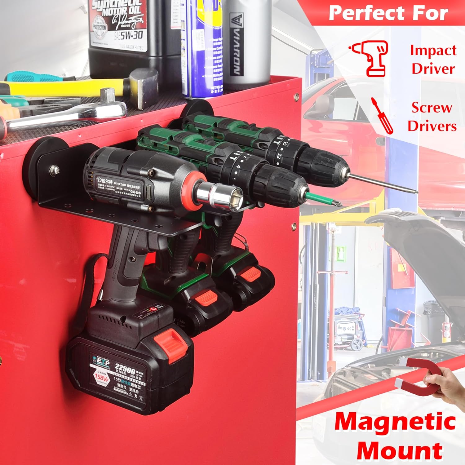- [Magnetic Power Tool Organizer] Without drilling holes, The magnetic-mounted power tool organizer uses a single-layer metal design. The 3-slots can store 3 cordless drills or wrench drills, and the edge holes can store 10 screwdrivers