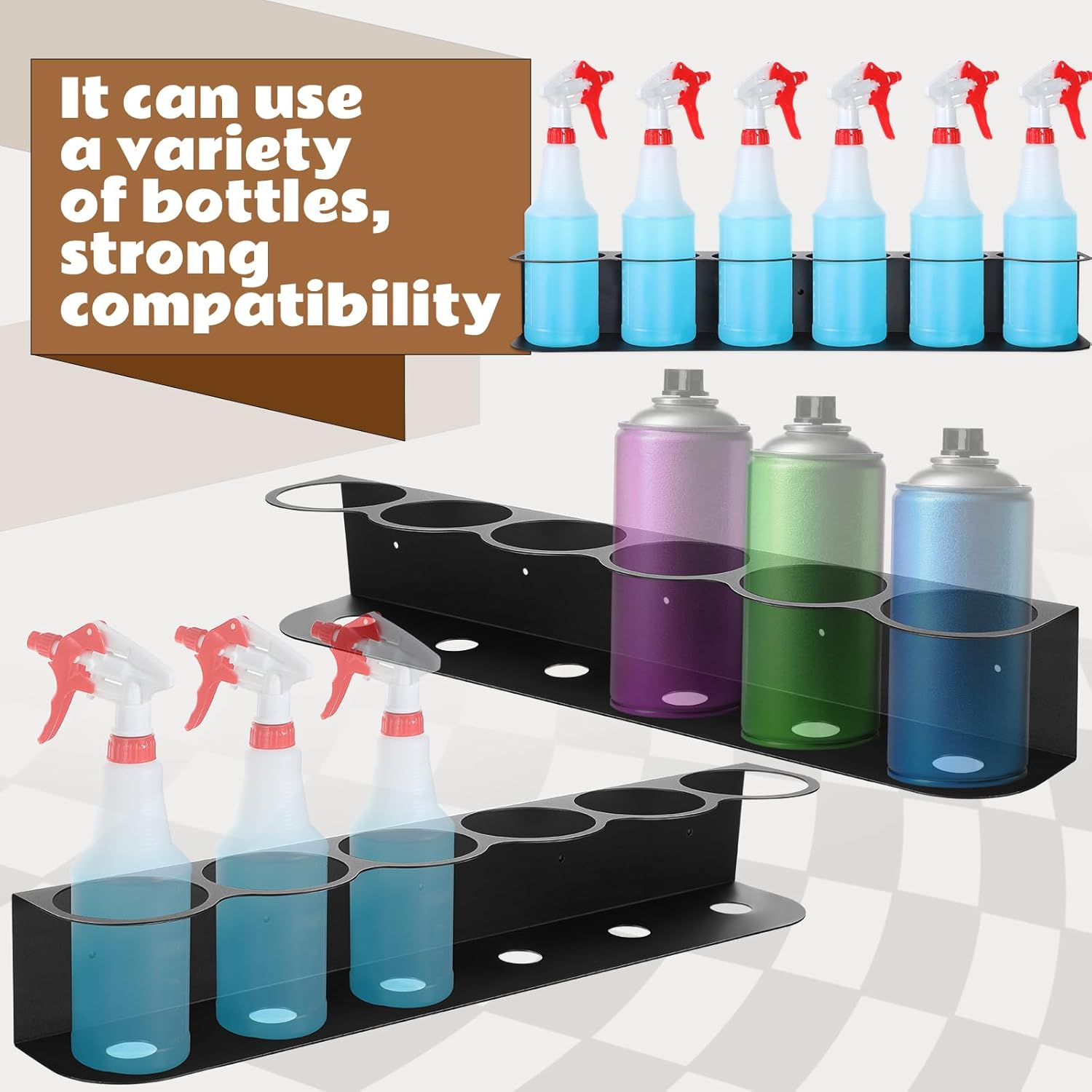 - Versatile Use: the bottle rack wall mount can be applied in various settings, from professional workspaces to home garages; It is ideal for holding cleaning supplies, solvents, spray bottles and more, giving you the freedom to store whatever you need in a neat and organized way; The black color also adds a sleek, modern touch to any space