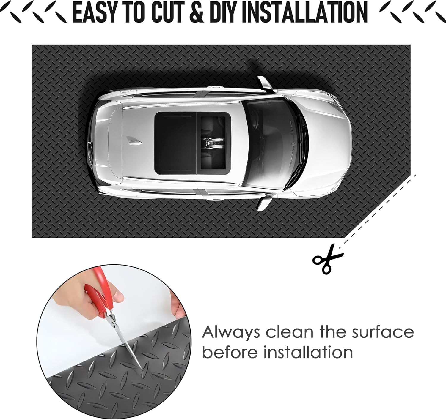 - Durable and Non-slip: Rubber flooring roll for under cars experience superior traction with our treated diamond patterns, ensuring a secure grip. It won't roll up under your vehicle, delivering long-lasting floor protection
