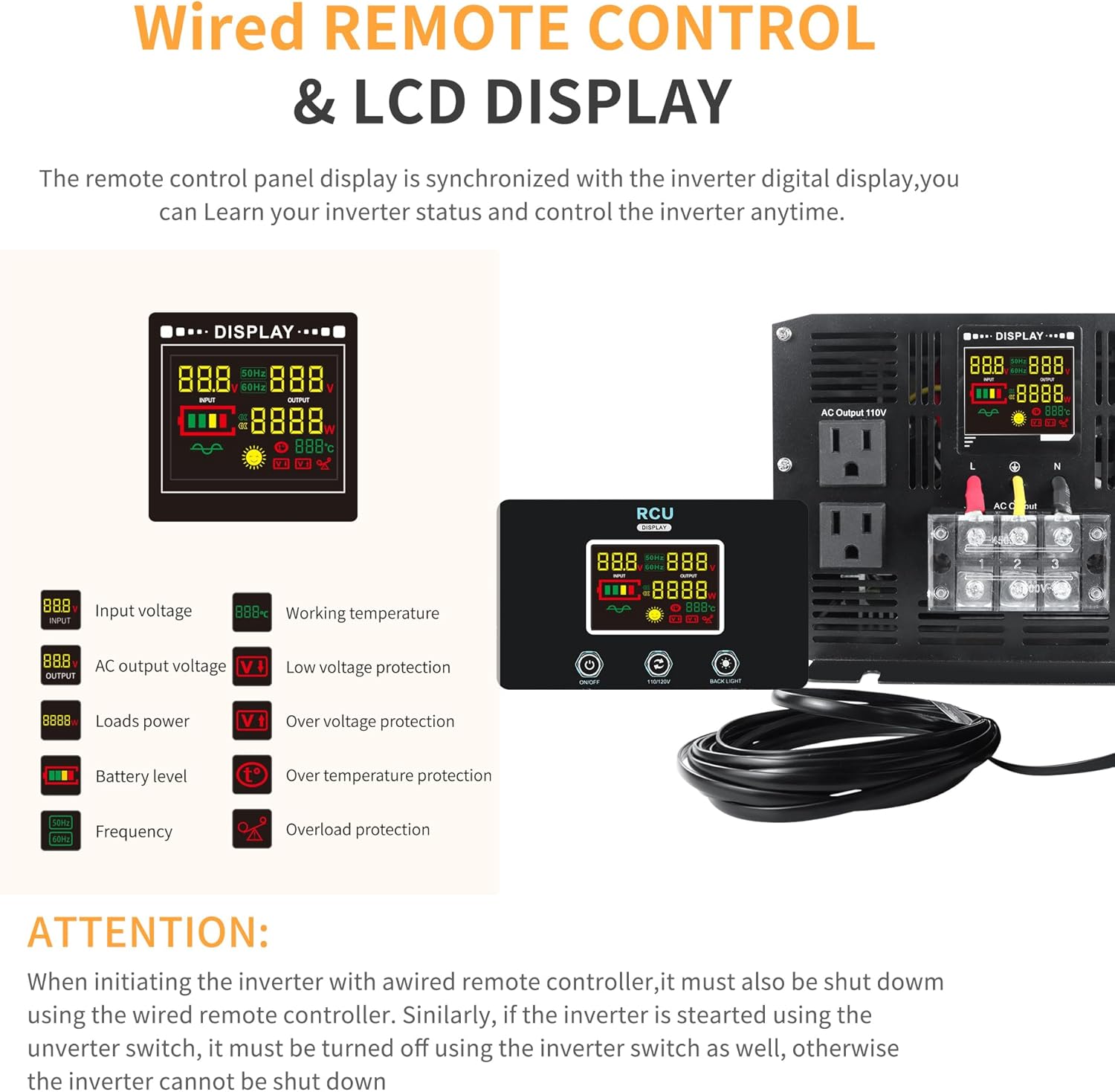- 【LCD Display & Wired Remote Control】 The 24V power inverter displays real-time input and output voltage, providing clearer and more important usage status information (battery voltage and output power). A wired remote control is more convenient to operate a pure sine wave inverter