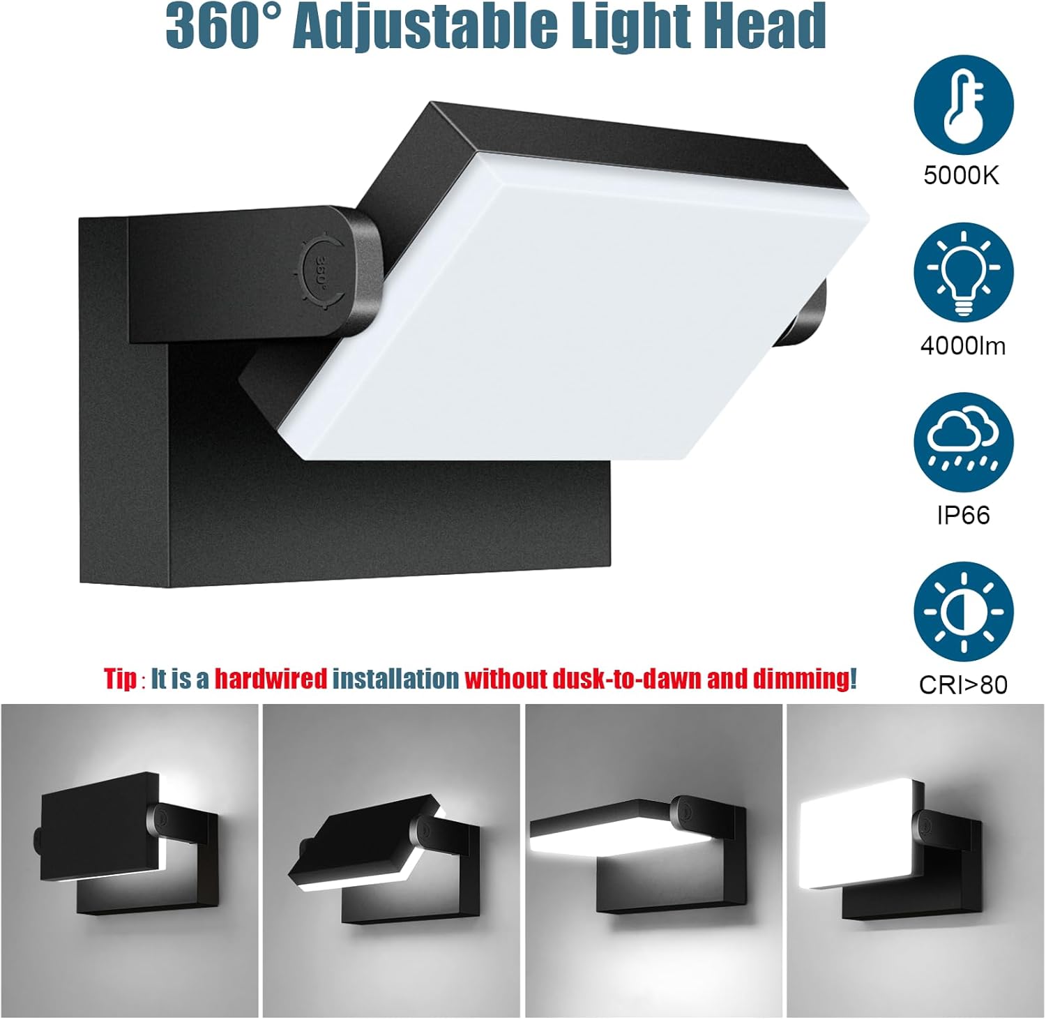 - Modern and Comfortable Lighting: 4000 lumens with 360° rotatable modern outdoor wall light fixtures , dimensions 9.1*6.3*4.5 inch , power 40W, 5000k color temperature, The wall pack light is soft and uniform, not dazzling. Very suitable for indoor and outdoor installation, also adding a sense of comfort to your home