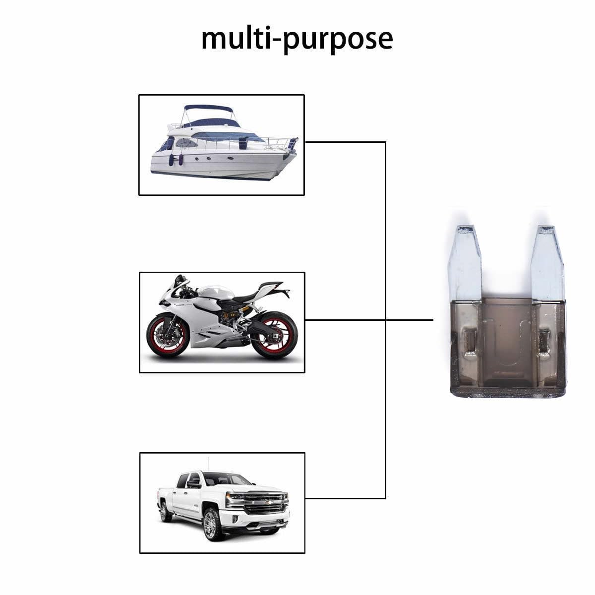 • WIDELY USE - These assorted fuses are specifically designed for Cars, Trucks, SUVs, ATVs, UTVs, Camper RV, Motorcycles, Fleet, Golf Car, Boat, snowmobiles, and most general DC applications etc., covering such components as radio, light, turn signals, etc.