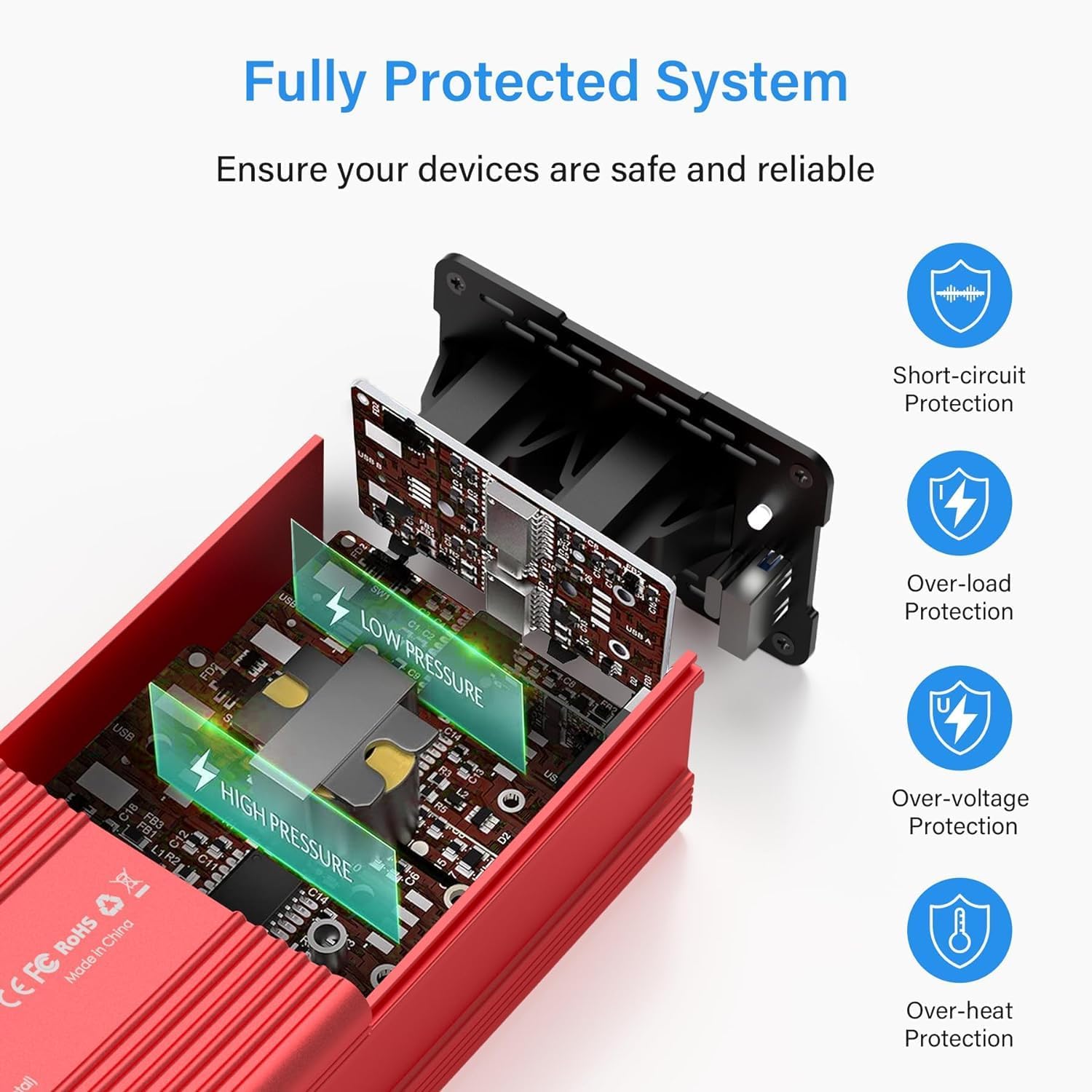 - 【Built to Last and More Safety】The aluminum alloy housing provides sturdy housing protection and effectively dissipates heat, ensuring efficient operation for a long time. Built-in advanced MCU intelligent chips, automatically identify the voltage and current required by different devices, preventing machine overheating, undervoltage, overcurrent, overvoltage, overload, and short circuits.