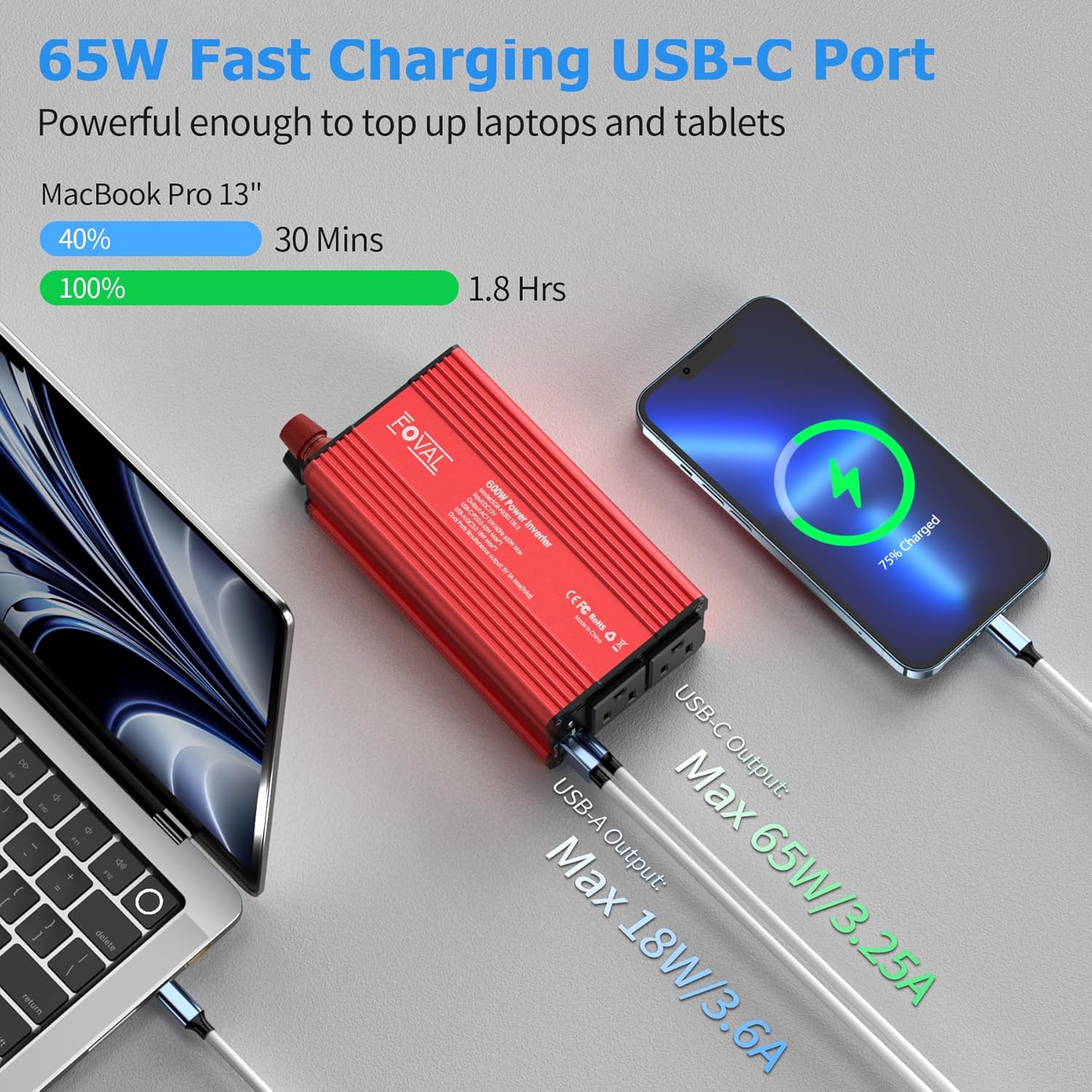 - 【High-Speed 65W Charging】The Car Inverter can deliver fast and efficient power to a wide range of devices, including smartphones, tablets, laptops, and other electronic devices. Charge your MacBook Pro 14" to 50% in just 37 minutes or quickly power up your iPhone, Galaxy S22, iPad, MacBook, and HP laptops.