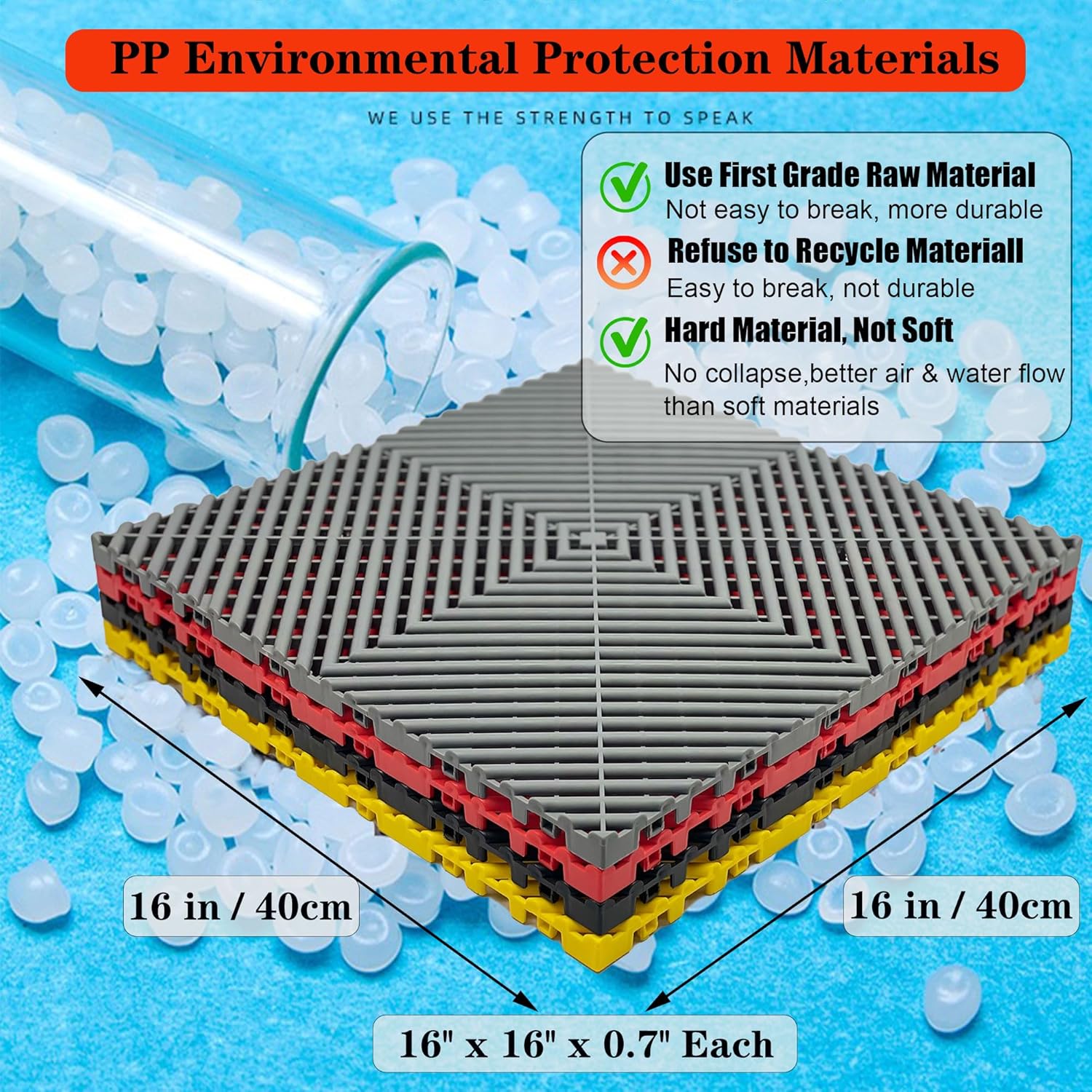 - Includes 24 Durable Tiles:Get 24 heavy-duty 16"x16"x0.71" interlocking drainage mats covering 41.3 sq ft for your garage, basement, workshop or wet areas