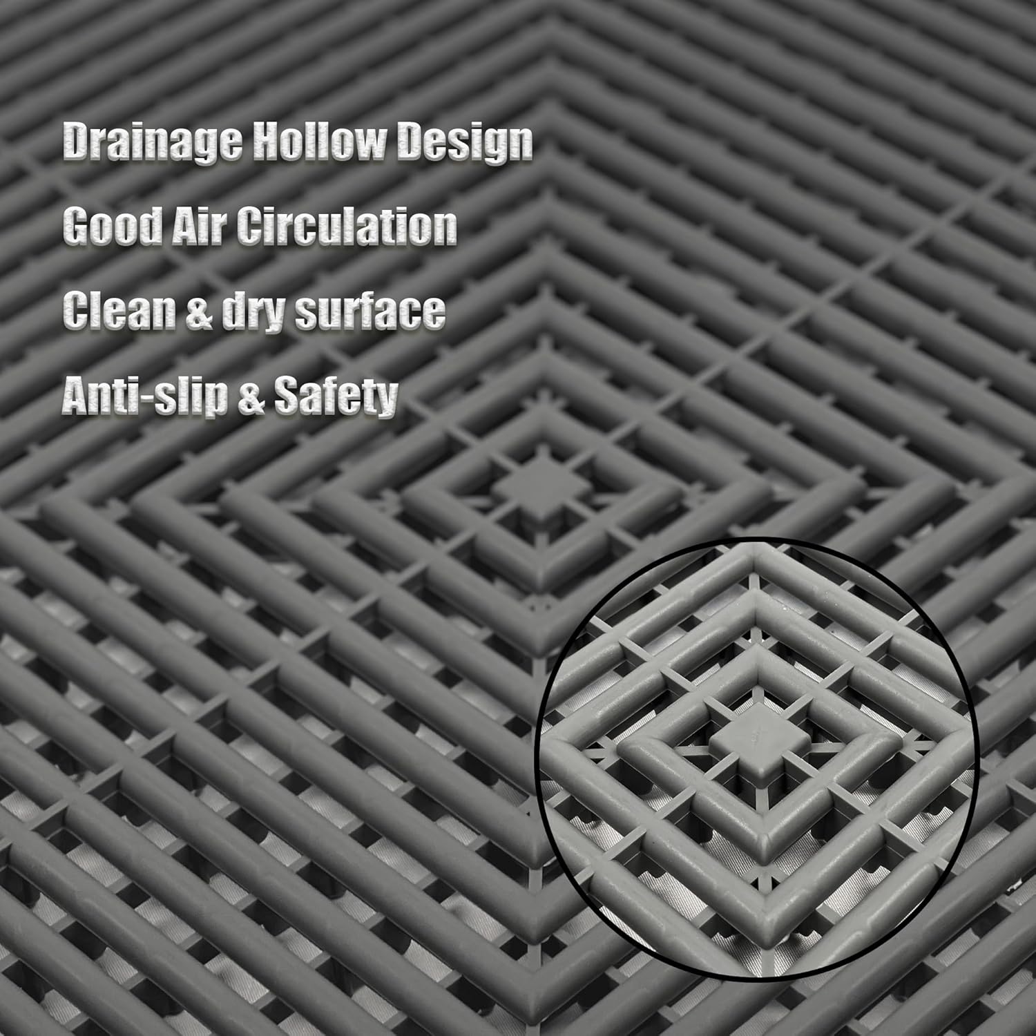 - Superior Drainage & Easy Cleaning:Drainable garage floor tiles,open grid design rapidly drains water, sand, and debris while allowing ventilation for a cleaner, drier surface; simply hose down for maintenance