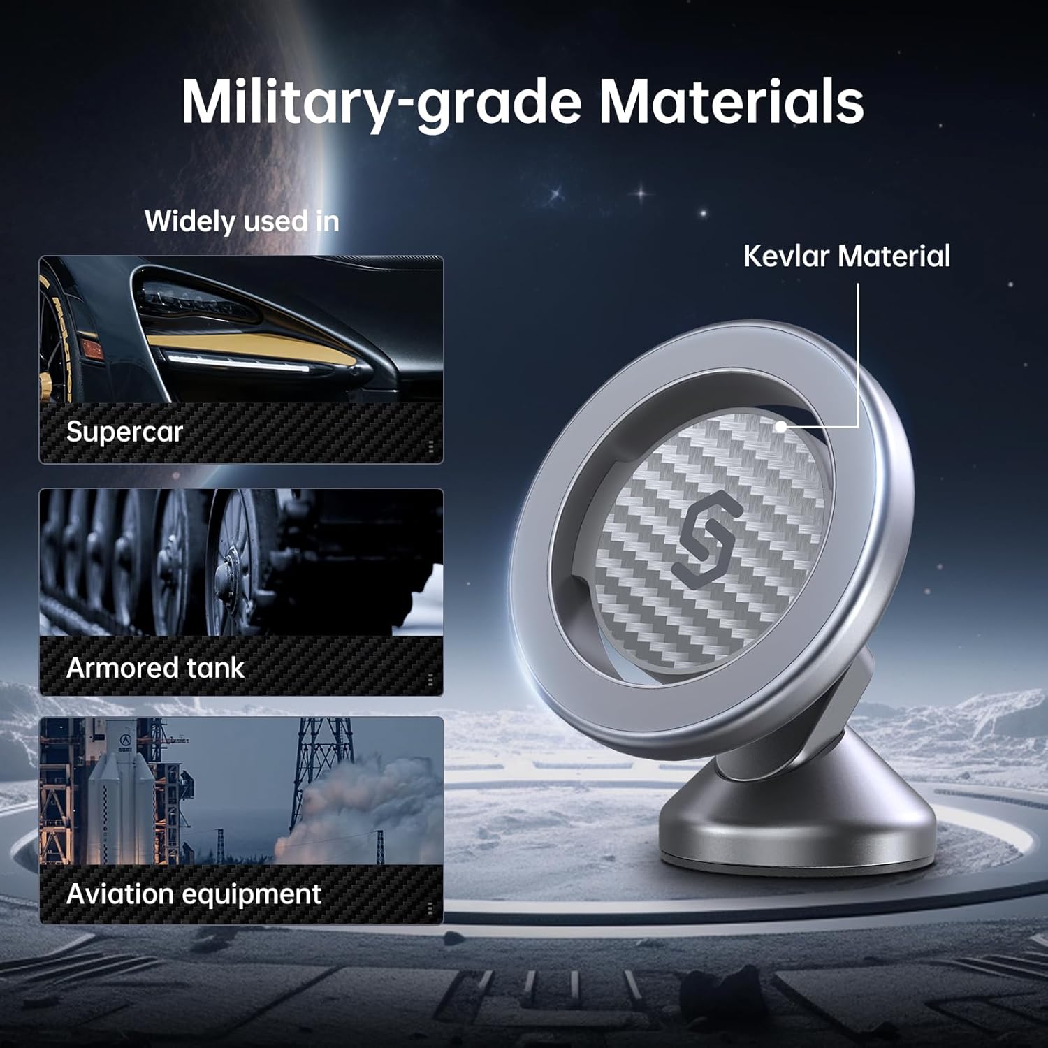 - 【 Protective Kevlar Material】Constructed from Protective Kevlar material, the panel part of this Magnetic car phone holder combines lightweight design with exceptional durability for reliable performance. The Kevlar construction not only ensures strength but also adds a stylish aesthetic to your vehicle's interior.