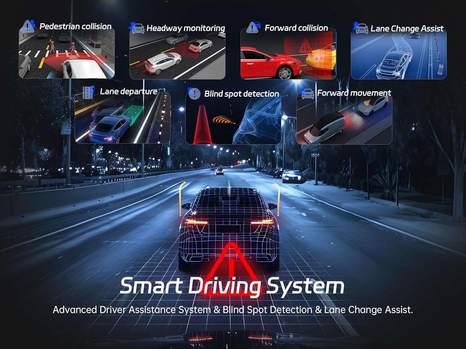 - [Smart Driving Assistance System] This car dash camera built in ADAS(Advanced Driver Assistance Systems), BSD(Blind Spot Detection), and LCA(Lane Change Assist), improve driving safety by alerting you to front collisions, maintaining safe distances, detecting pedestrians, notifying when the front vehicle moves, warning of lane departures, and identifying vehicles in blind spots or overtaking from the sides,which keeps you and your loved ones secure on every drive.