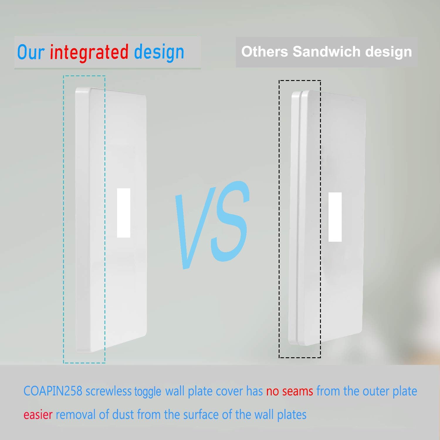 • 【Safe and High Quality】COAPIN258 Toggle wall plate cover is no visible screw design for child safety. Fire resistant material with no fire hazard. Switch Outlet cover is made of durable unbreakable polycarbonate thermoplastic, blank outlet cover is flexible and resilient which can withstand bends, twists, hard impacts and heavy force, light switch cover plate heat resistant to temperatures over 100°F to protect against discoloration and fading over time.