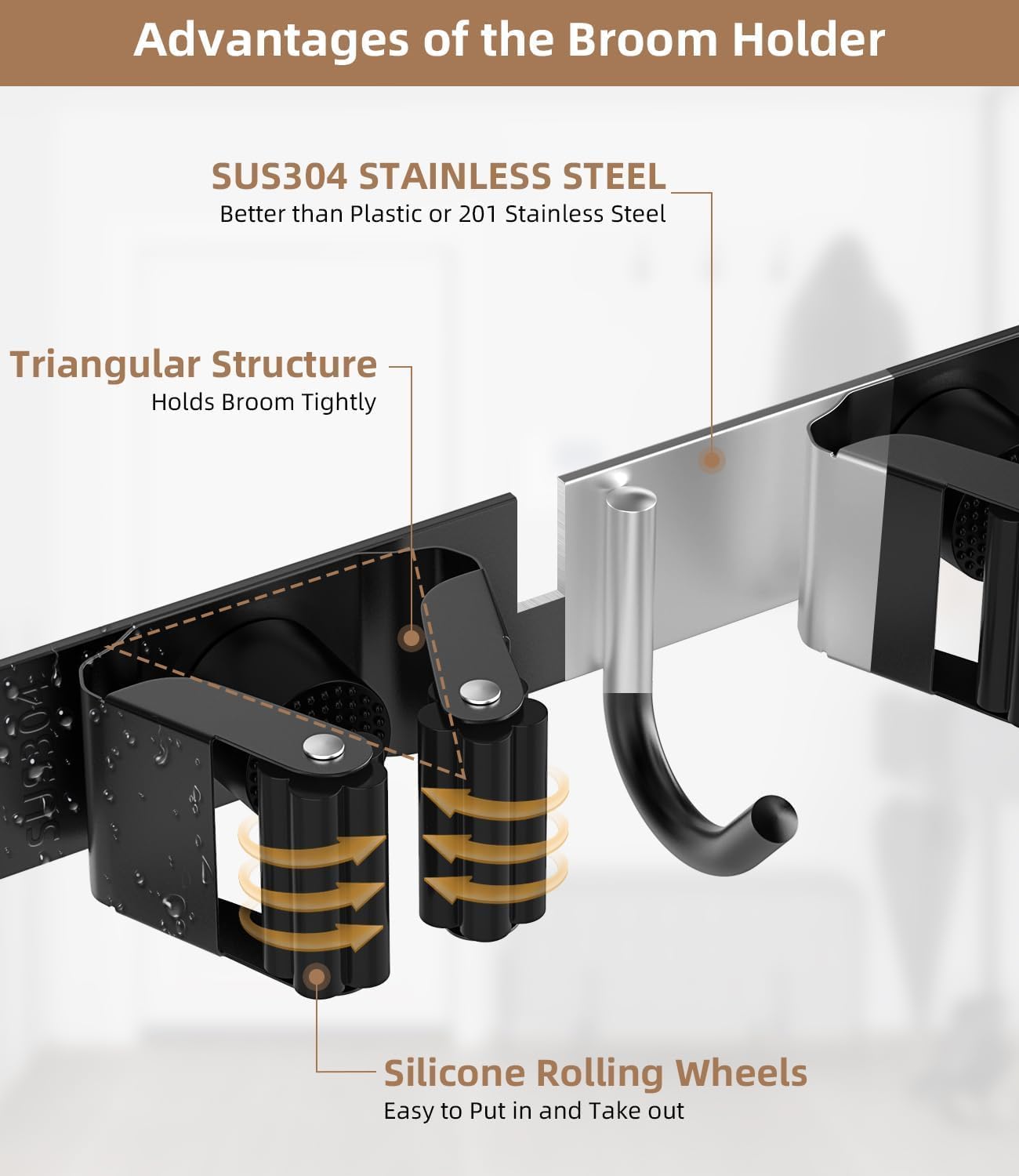 - 304 STAINLESS STEEL , ANTI-RUST & STURDY: The mop and broom holder wall mount is made of 304 stainless steel, making it corrosion-resistant, moisture-proof, and waterproof. Compared with plastic broom racks, it is stronger and more premium quality. This garage organization can hold up to 30 pounds when installed with screws, and the hook can also support your steam mop.
