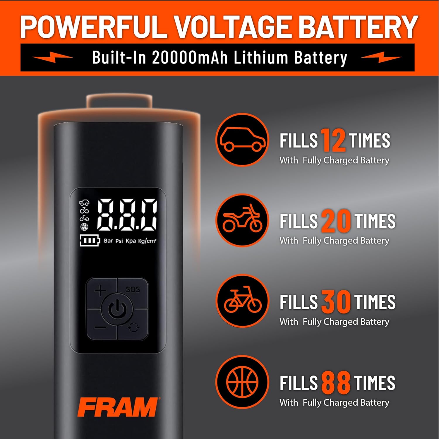 - 4 MODE AIR PUMP: The FRAM portable tire inflatoroffers diverse pressure units, such as PSI, BAR, KPA, KG/CMΒ², you can easily select the best option for you. This cordless, digital display, electric inflator also has 4 modes, with 5 different attachments for each mode, and a large battery capacity that wonβt let you down.