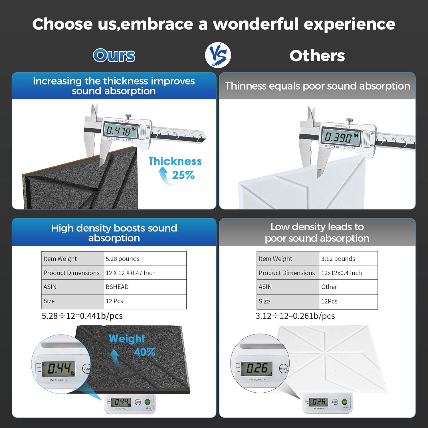 • 【Excellent Quality】: This wall soundproofing foam board is made of high-quality 100% polyester, odorless and flame retardant. There are no risks associated with spending long periods of time in a room with acoustic foam panels. And compared with traditional sound-absorbing panels, our products have higher thickness (25% thicker) and density (35% denser), which means better durability and stability, and will not be easily deformed after long-term use.