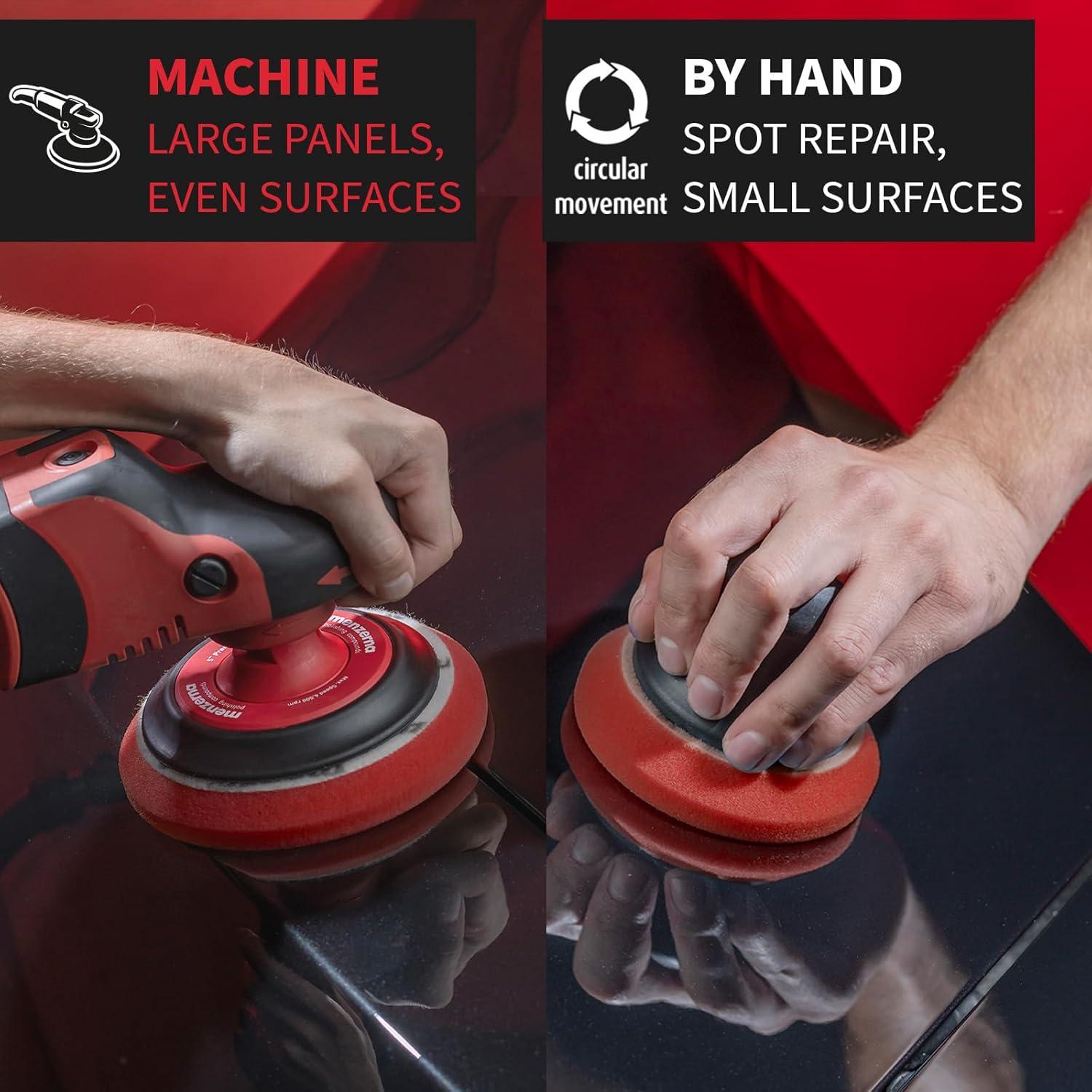 - BEGINNER FRIENDLY: Clean the surface with the Menzerna Control Cleaner. Apply 3-7 drops of polish to the red Heavy Cut Foam pad. Polish until the greasy looking film looks slightly translucent and remove polish residues. Take a second stage of polishing with the Cut Force Pro with the green Soft Cut Pad. Follow Up with the Menzerna Power Lock Sealant.