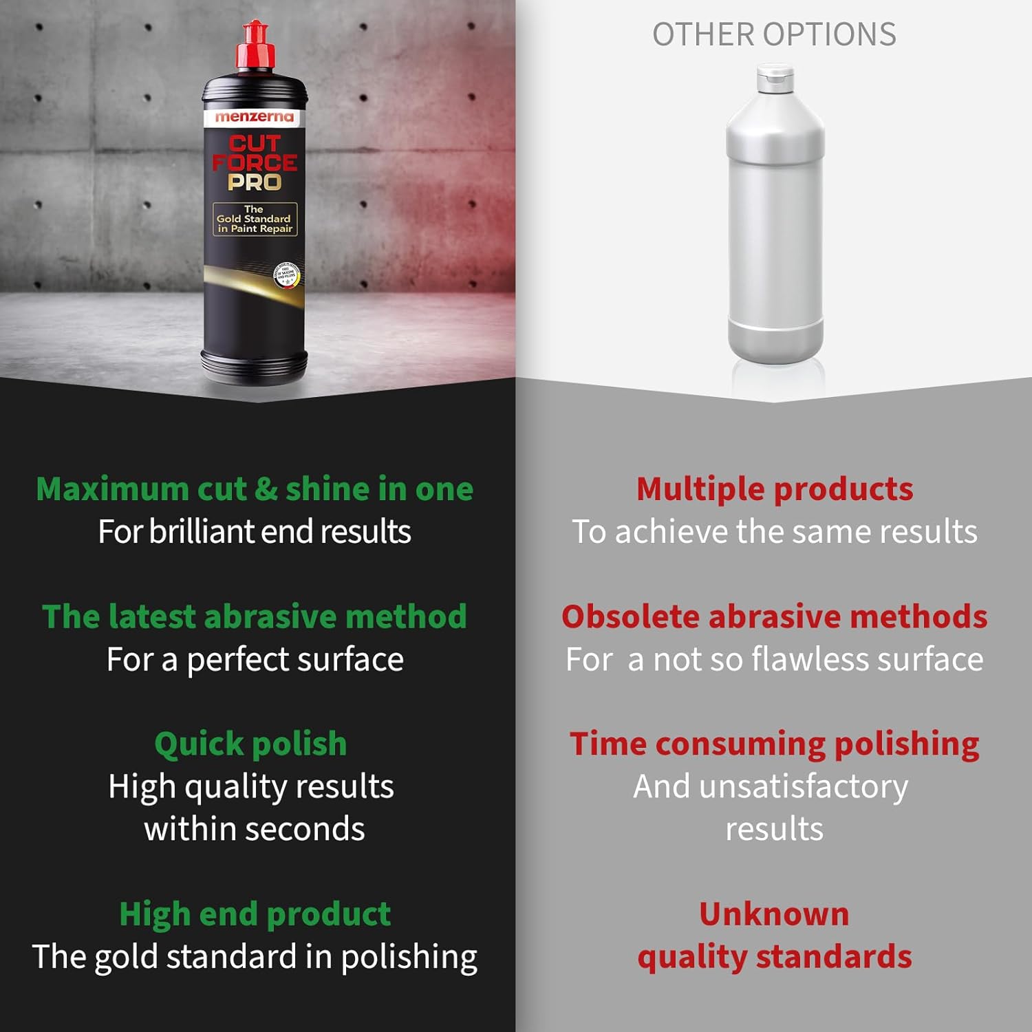 - 2 STEPS IN 1 FOR INCREDIBLE RESULTS: Cut Force Pro ensures maximum removal while maintaining excellent gloss. An absolute innovation from the Menzerna premium laboratory. It gets the job done without the hassle to switch between different products. Ideal for reconditioning used vehicles!