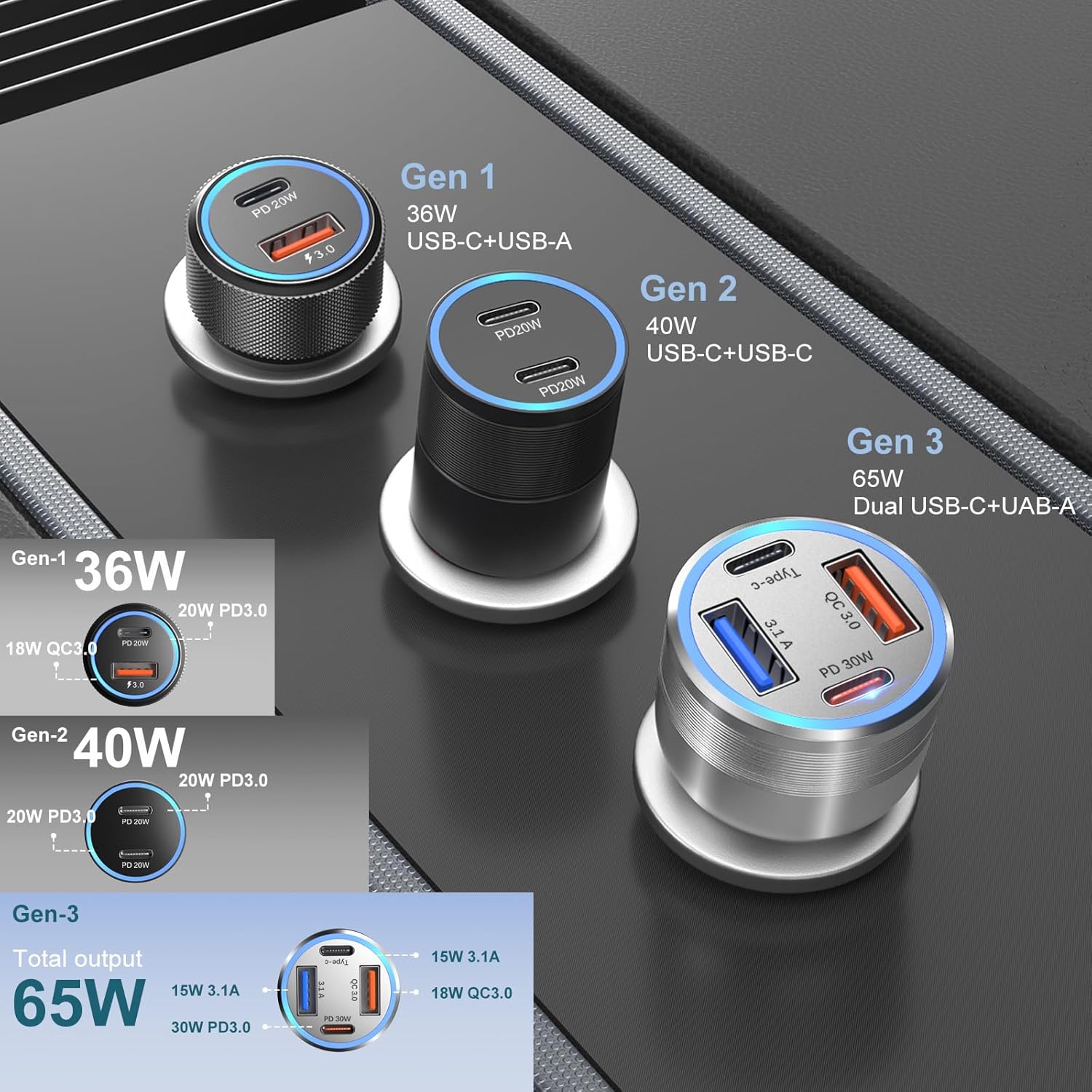 - [What You Get] 65W 4 Ports USB A & USB C Car Charger Adapter. As a newborn brand, we care customer most. Provide high quality products and prompt customer service is our goal. If you receive any defective chargers or have any other problems of our products, please feel free to contact us.