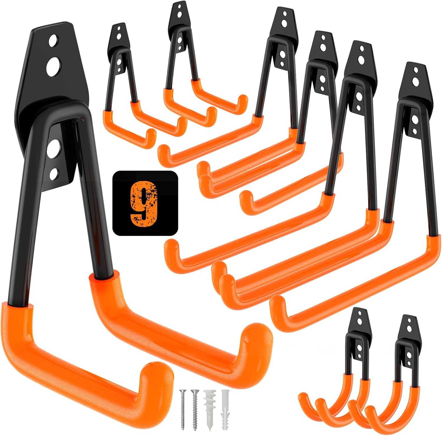 QcoQce 9 Pack Heavy Duty Hooks, Garage Wall Storage for Hanging and Organizing Tools, Bikes, Ladders, Ropes, Garden Tools and Bulky Items (Orange)